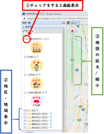 大和町地域資源マップ 使い方 大和町地域資源マップの操作方法と手順 操作1:左側項目覧の活動や地域にチェックを入れてみよう! 項目にチェックを入れると地図に表示されるぞ! 操作2:活動内容を見てみよう! 地図に表示されているマークをクリックすると、活動内容を見ることができるぞ! 手順1:行政区(町内会、自治会)と集会所を探してみよう! 地域の集会所では、様々な活動が行われています。 まずは、自分が住んでいる行政区を探してみましょう! 手順2:地域の資源を探してみよう! 自分が参加したい地域活動や、生活に必要な情報などあるかもしれません。 まずはいろいろな資源を探してみよう! 手順3:「気になる!参加したい」と思ったら、、 内容に合う活動が提供できるように、生活支援コーディネーターがサポートします! 気になる!参加したい!情報があれば、下記の連絡先にご連絡ください。