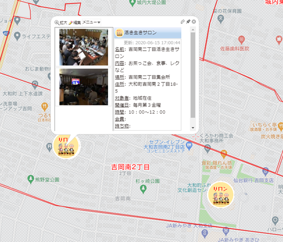 大和町地域資源マップ 生活支援コーディネーターが見つけた地域資源を掲載。 自分が住んでいる地域の活動や生活支援サービスなどを、インターネット上で公開しています。 スマートフォンやタブレットなら、いつでもどこでも見れますので是非ご活用ください! →→→ 拡大表示については、こちらをクリック下さい ※使い方については、下記に記入しています。