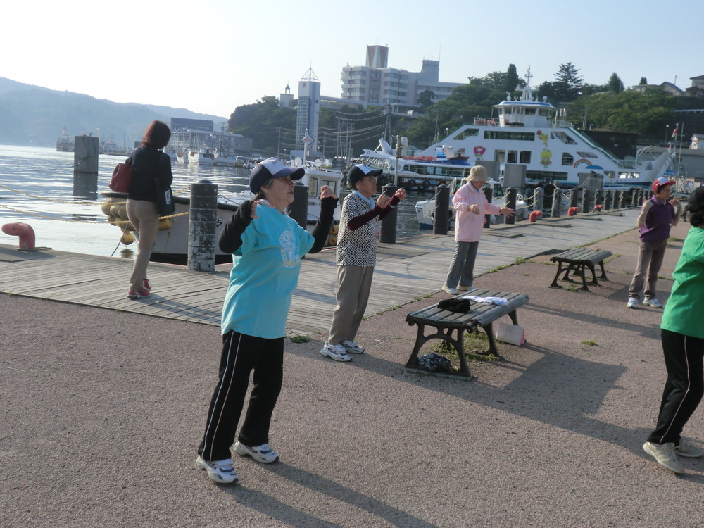 大島に向かう観光客やボランティアさんたちが一緒に体操する事もあります。
