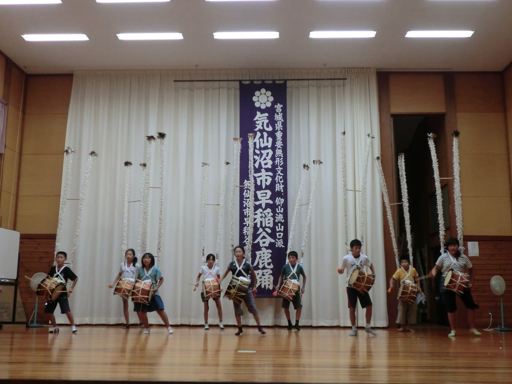 8月19日(火)19:30から早稲谷伝承館にて行われていた「早稲谷こども鹿踊り教室」におじゃましました。早稲谷鹿踊りは180年程前、一関市大東町大原から伝わったとのこと。2004年から月立小学校の児童に指導していて、年10回。5,6年生を対象に「こども鹿踊り教室」を開催しています。この日は”ささら”と太鼓を身に付けた生徒が、小学校での行事や来年2月の発表会に向けて熱心に稽古していました。子供達が伝統芸能を受け継いでいる姿は眩しく、強く印象に残りました。