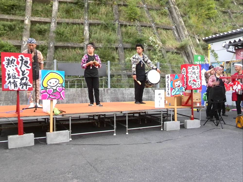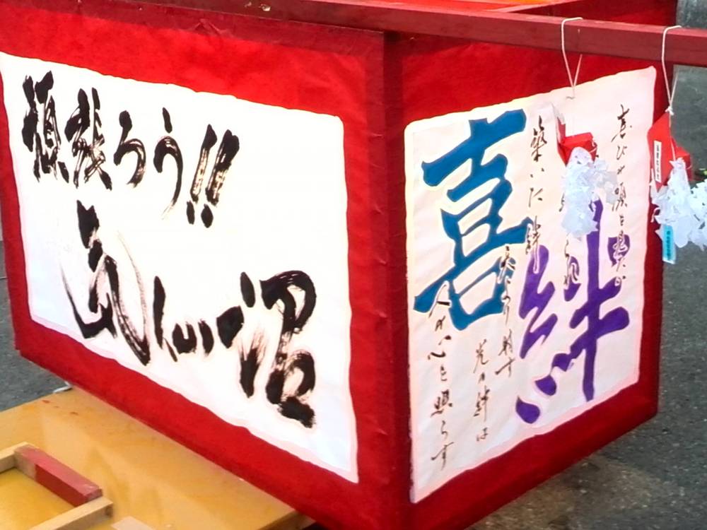 震災後、毎年気仙沼市のために作成したねぷたと共にお囃子の演奏を聞かせてくれます。夜になると灯りがついた点いた「ねぷた」を集まった観客と一緒に巡行します。今年は「ヤーヤドー!!ヤーヤドー!!」の掛け声とともに紫市場を出発し、振商会通り~気仙沼信用金庫~七十七銀行の十字路~紫市場へと戻りました。