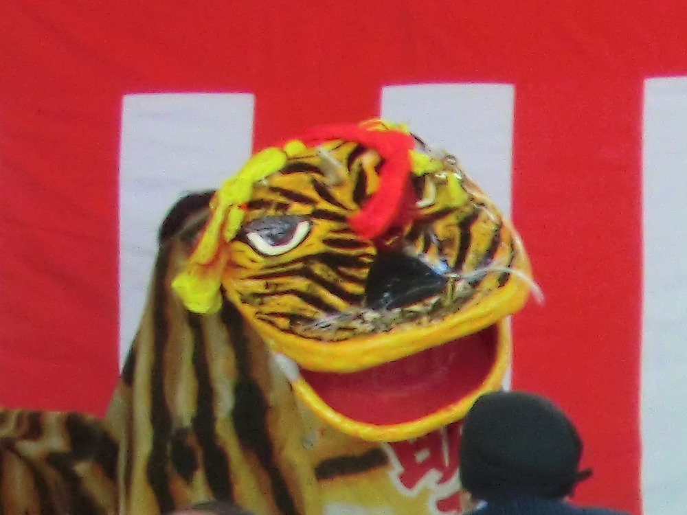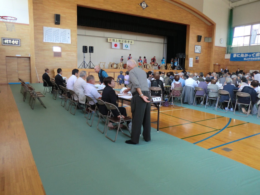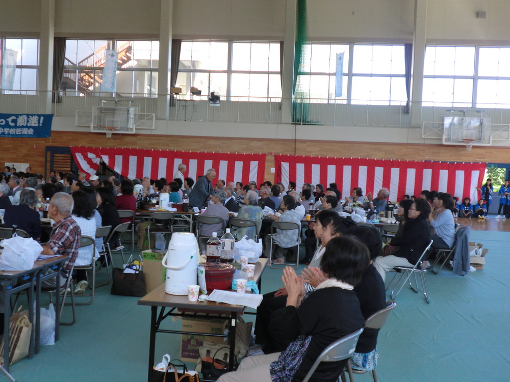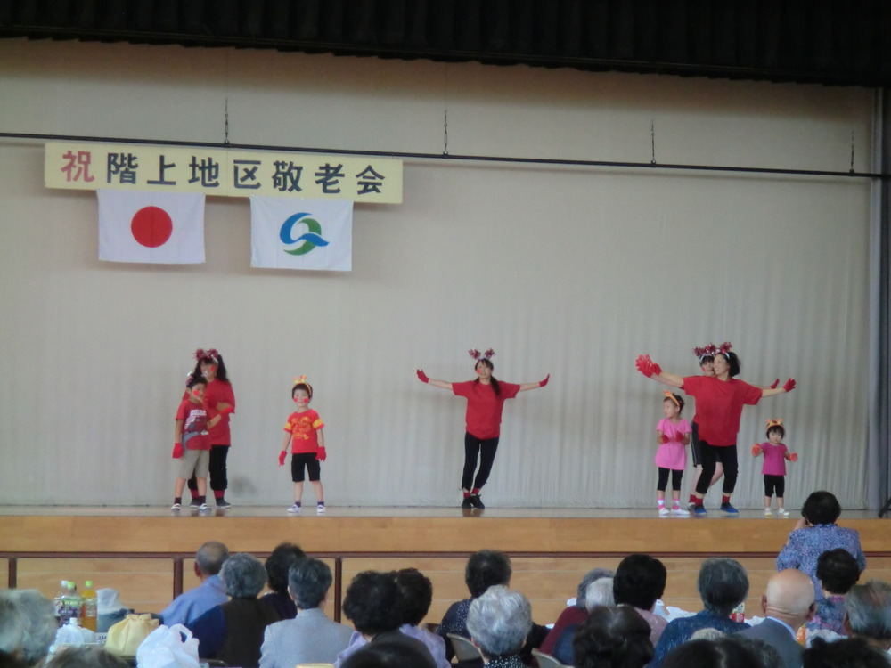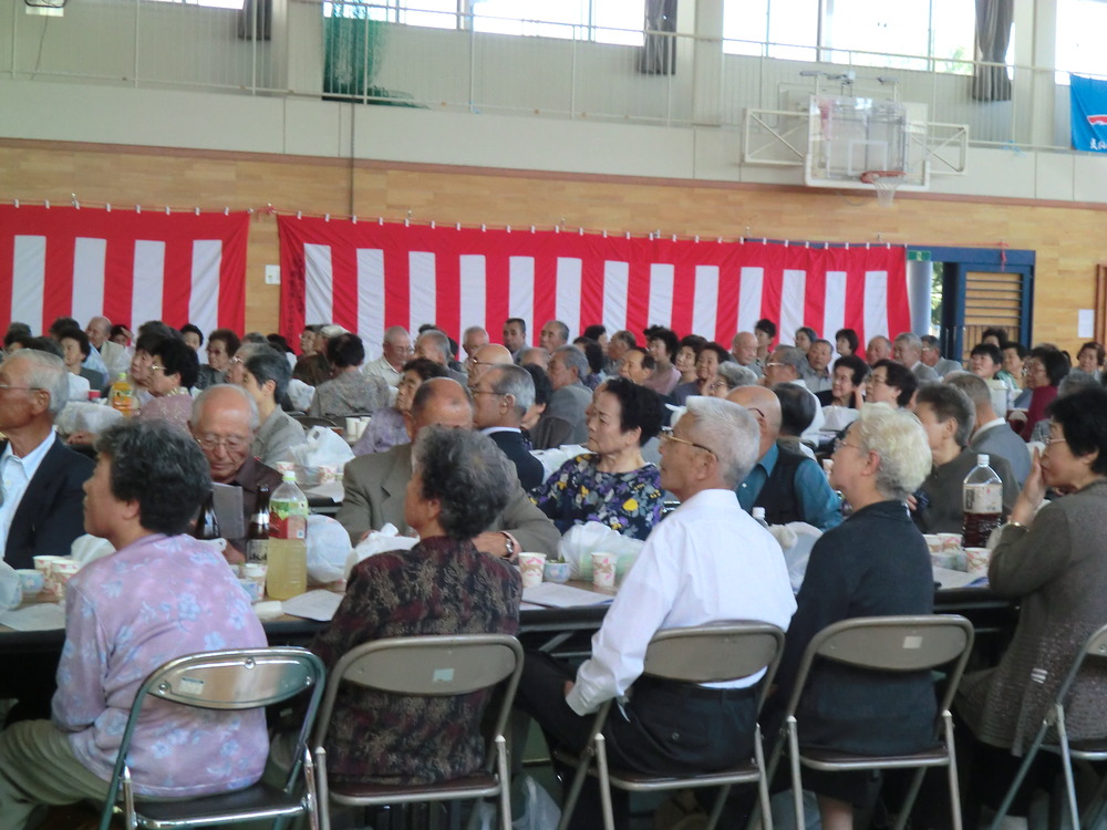 階上中学校体育館で敬老会が催しされ、77歳以上の高齢者の方が158人参加されました。歌や踊りの演目が多かったのは、芸達者な方々 が多い地区ならではでしたが、中でも小さいお子さんとお母さんのダンス「エビカニックス」は今年初登場で、その可愛らしさに皆さん大喜びでした。会の最後には恒例の明戸虎舞の虎さんに頭をかじって貰い、厄を落としてお開きとなりました。