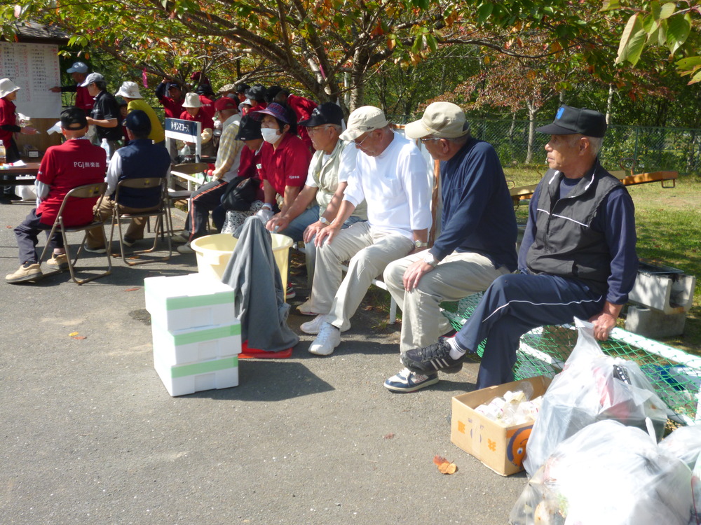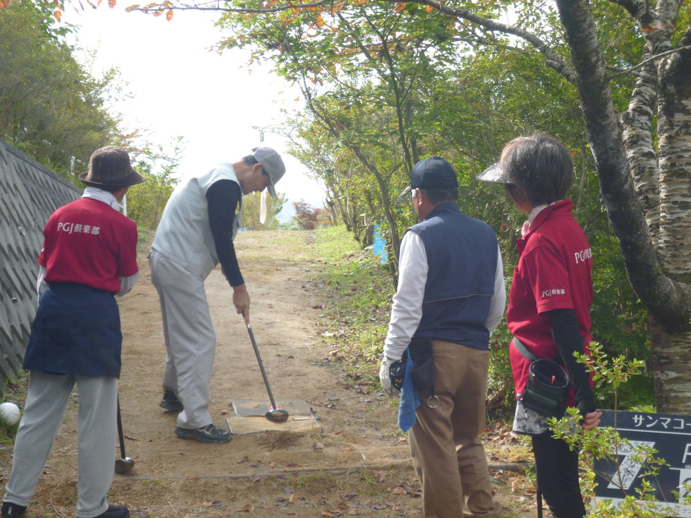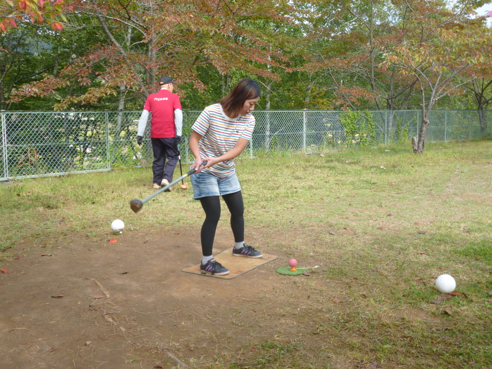 水梨パークゴルフ場は手作りで9コースあります。この小さなコースにはブランコや鉄棒があり、子供達が遊んでいる時も一緒にパークゴルフが楽しめます。大会には遠方より参加された方もいました。青空の下で、大きな笑い声をあげながら行うパワーゴルフが、皆さんの健康の秘訣かなと思いました。そして商品は”秋の味覚 サンマ”でした。