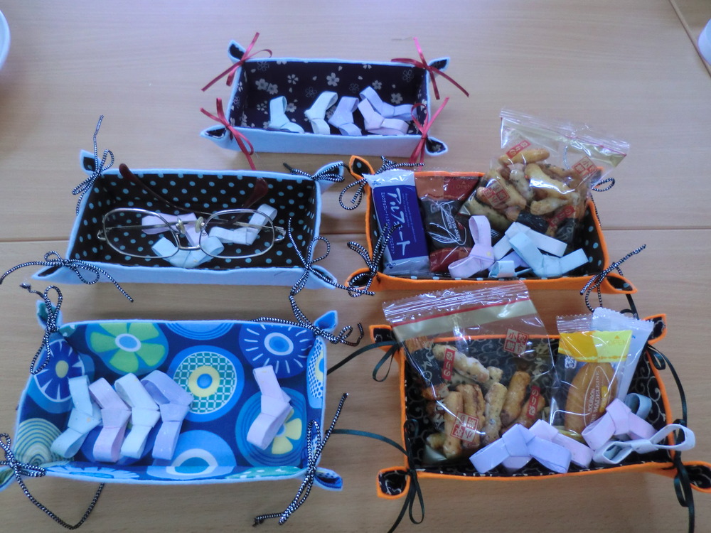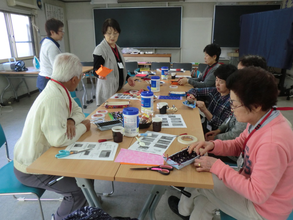 第2回の最初は田谷地区です。今回は牛乳パックを使ってトレーと箸置きを作りました。牛乳パックの内側はロウでコーティングされているので、布地を会わせてアイロンをかけると接着剤要らずでくっつきます。箸置きはクリスマスやお正月に良いでしょう?第1回目と同じ顔ぶれが揃い、会話が弾む交流会になりました。