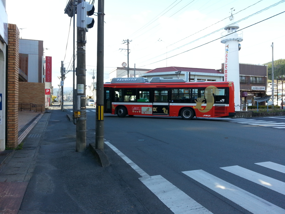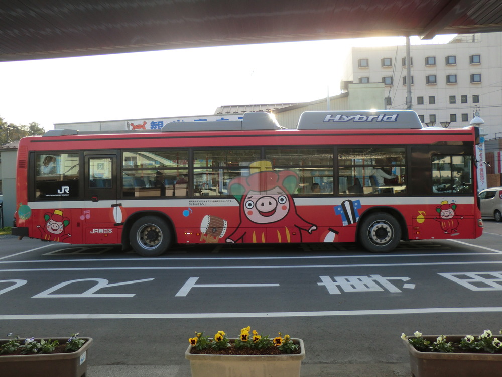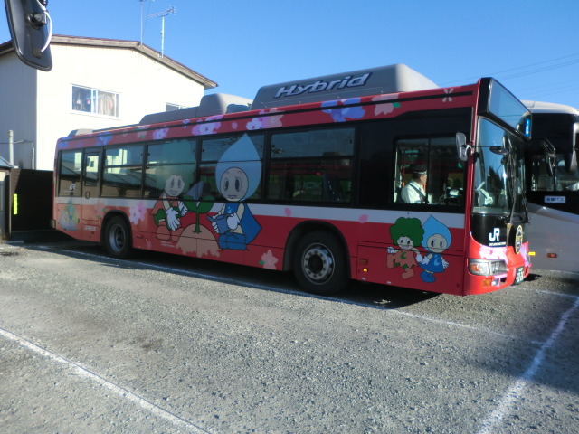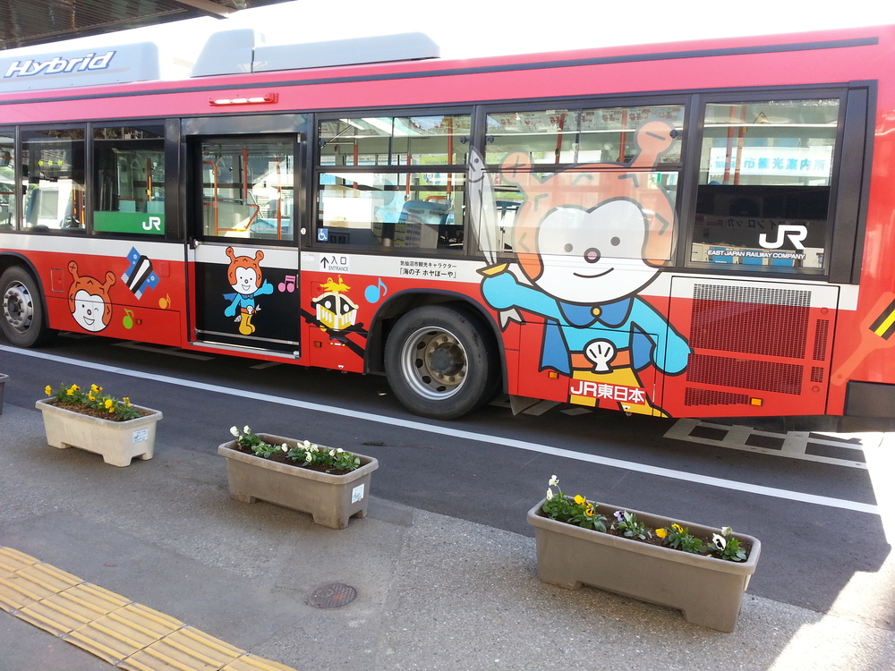 震災で大きな被害を受けたJR気仙沼線(柳津~気仙沼間)と大船渡線(気仙沼~盛)ですが、列車の替わりに運行しているのが、鉄道の仮復旧としての「BRT」です。BRTはバス高速運送システムの略で、バスを飾る沿線ゆるキャラが目を惹きます。運転手さんにお聞きしたら、バスは30数台走っていて、その模様は一台一台違うそうです。