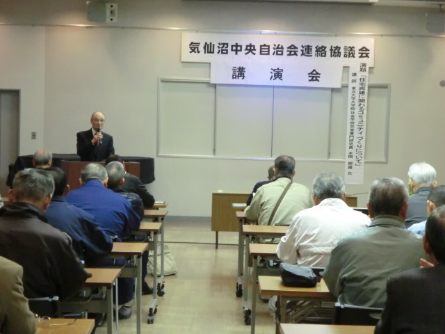気仙沼中央自冶連には震災後解散を余儀なくされた自冶会も含め66行政区あり、その内10地区に災害公営住宅が建設され、3地区が防災集団移転用地を有する事になっています。本日は本間照雄先生(東北大学大学院社会学研究室専門研究員)を講師に招き、「災害公営住宅に関わるコミュニケーションづくり」と題した研修会が行われました。