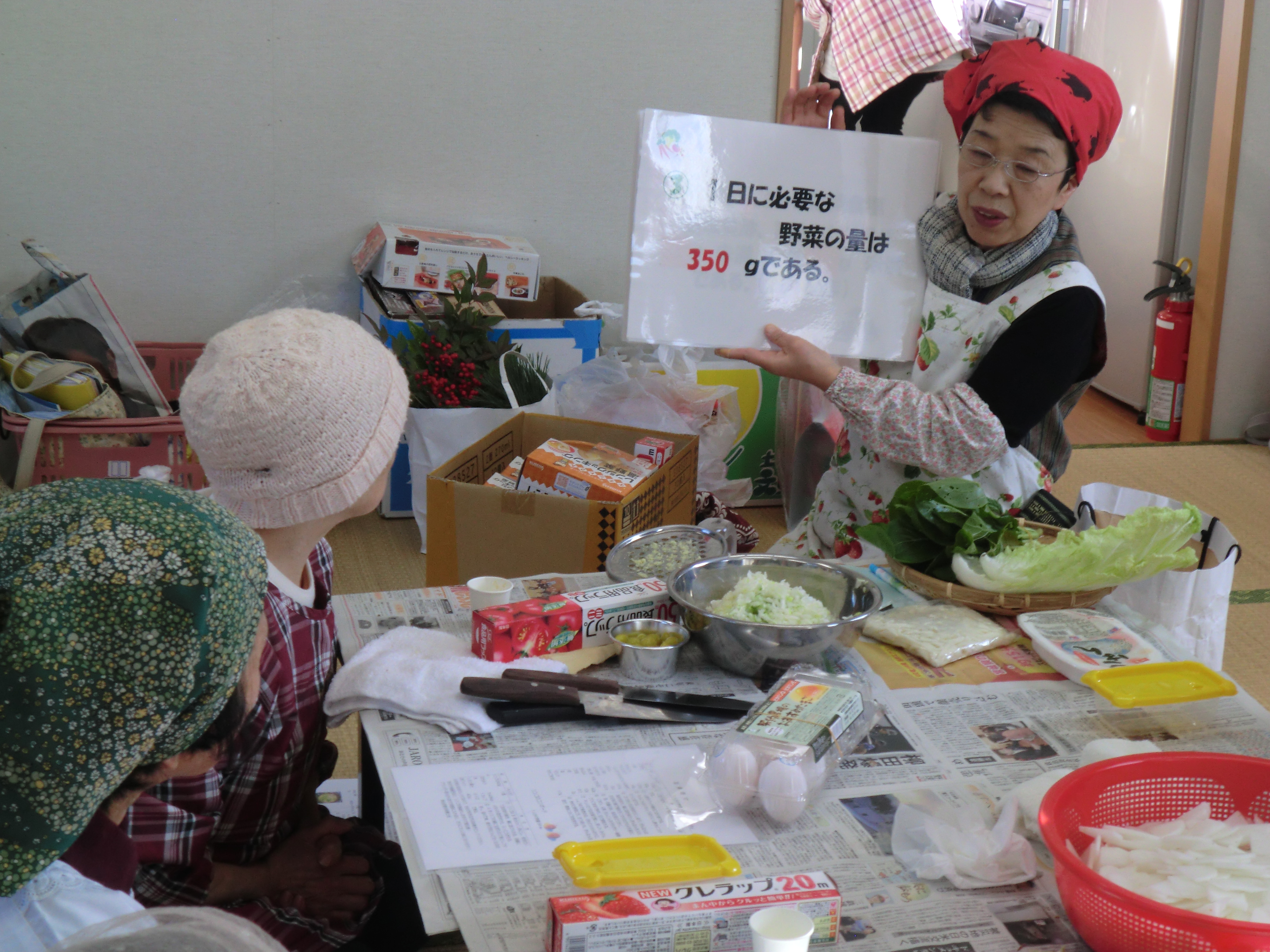 大島の新王平仮設住宅談話室で栄養士会さんによる料理教室が開催されました。本日のメニューは気仙沼の郷土料理、さんまのすり身汁です。塩分控えめ、しょうがを効かせたヘルシーメニューの出来上がり!!