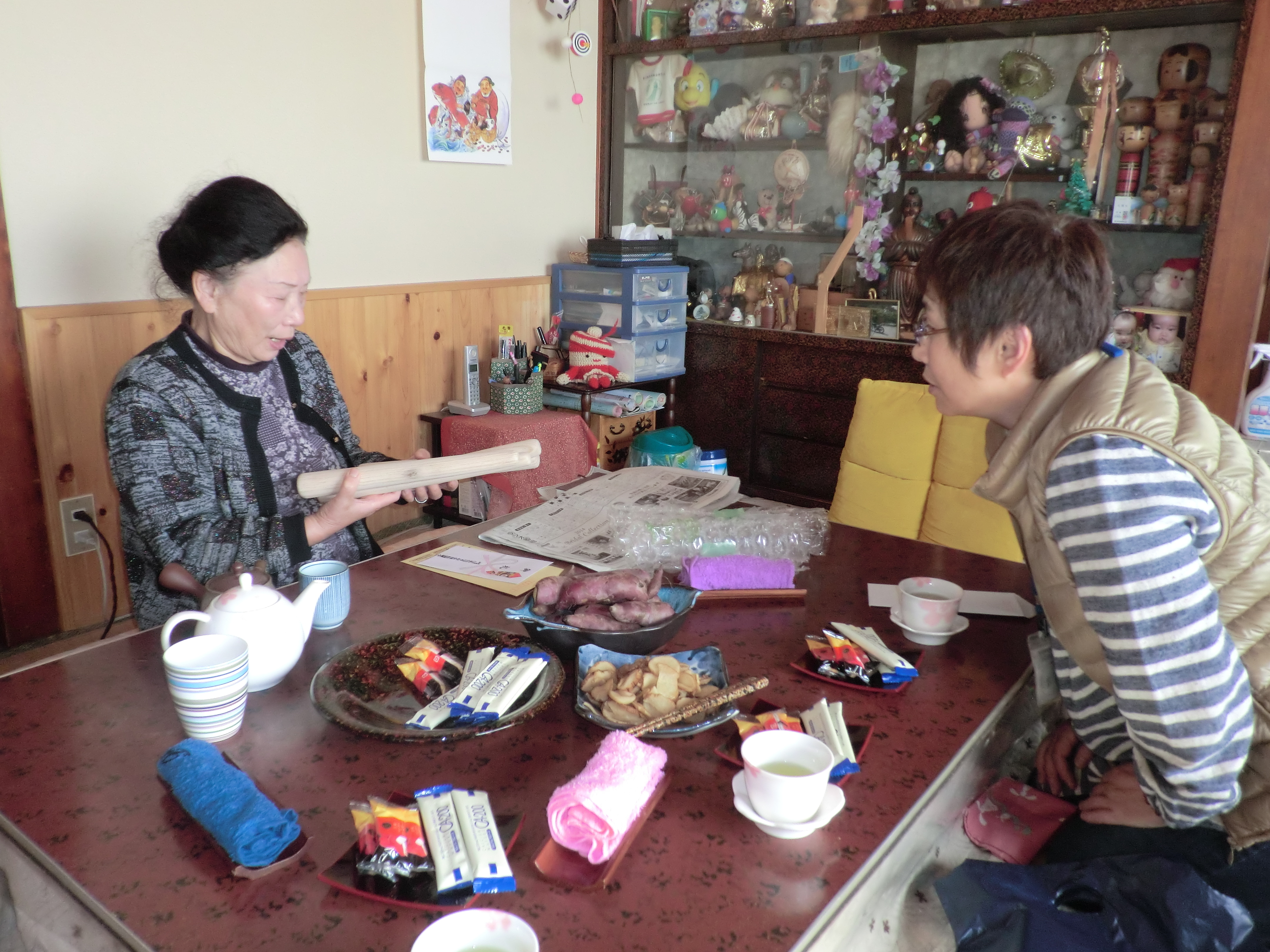 仙台「はまらいんや交流会」に向かう車中で、七福神保存会の方々から「太鼓のバチを作ってくれるお店が休止している為に、新しい品物が手に入らない」という話が出ました。同乗していた、趣味で木工芸品を製作している気社協齊藤会長がその話を聞き、太鼓のバチを自作し、七福神舞保存会に寄付する事にしました。材質は桐で、先が細目と太目の二組の会長の作品を、私達(相談員)が伺いお渡ししました。受け取った保存会の代表は「これが”縁”なのかもしれないですね。大切に使わせていただきます」と、嬉しそうに話されていました。