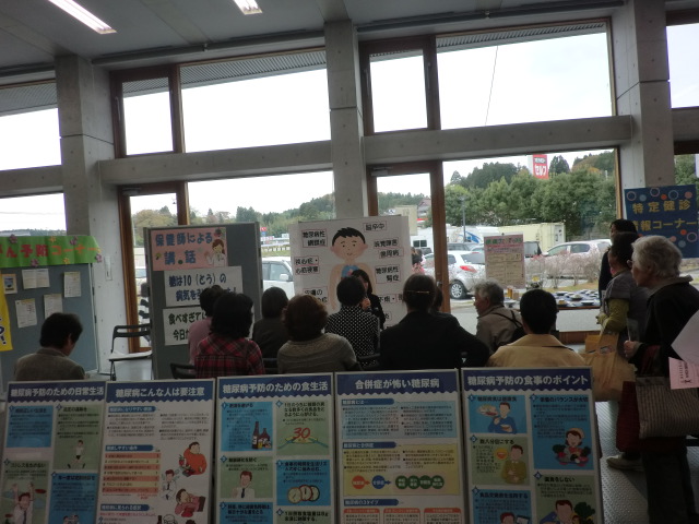健康フェスティバルは、「気仙沼健康プラン21」および「食育推進計画」に基づき、生活習慣病やストレスによる健康状態の悪化・身体機能の低下等を予防し、市民の健康保持・増進を図ることを目的として毎年開催されています。本年度は、本市特定健康診査の結果において血糖値の高い方が県内市町村と比較して多い現状から「糖尿予防」をテーマに開設しました。主な内容は、糖尿病に関する相談・各種測定・パッククッキング・試食・軽トラ市・歯の健診・肩こり・腰痛に効く体操・ベビーマッサージ・お酒やたばこに関する相談などです。健康に関心のある方が集まったので、各コーナーはにぎわっていました。フェスティバルに参加した人の中には震災後初めて会った方もいた様です。