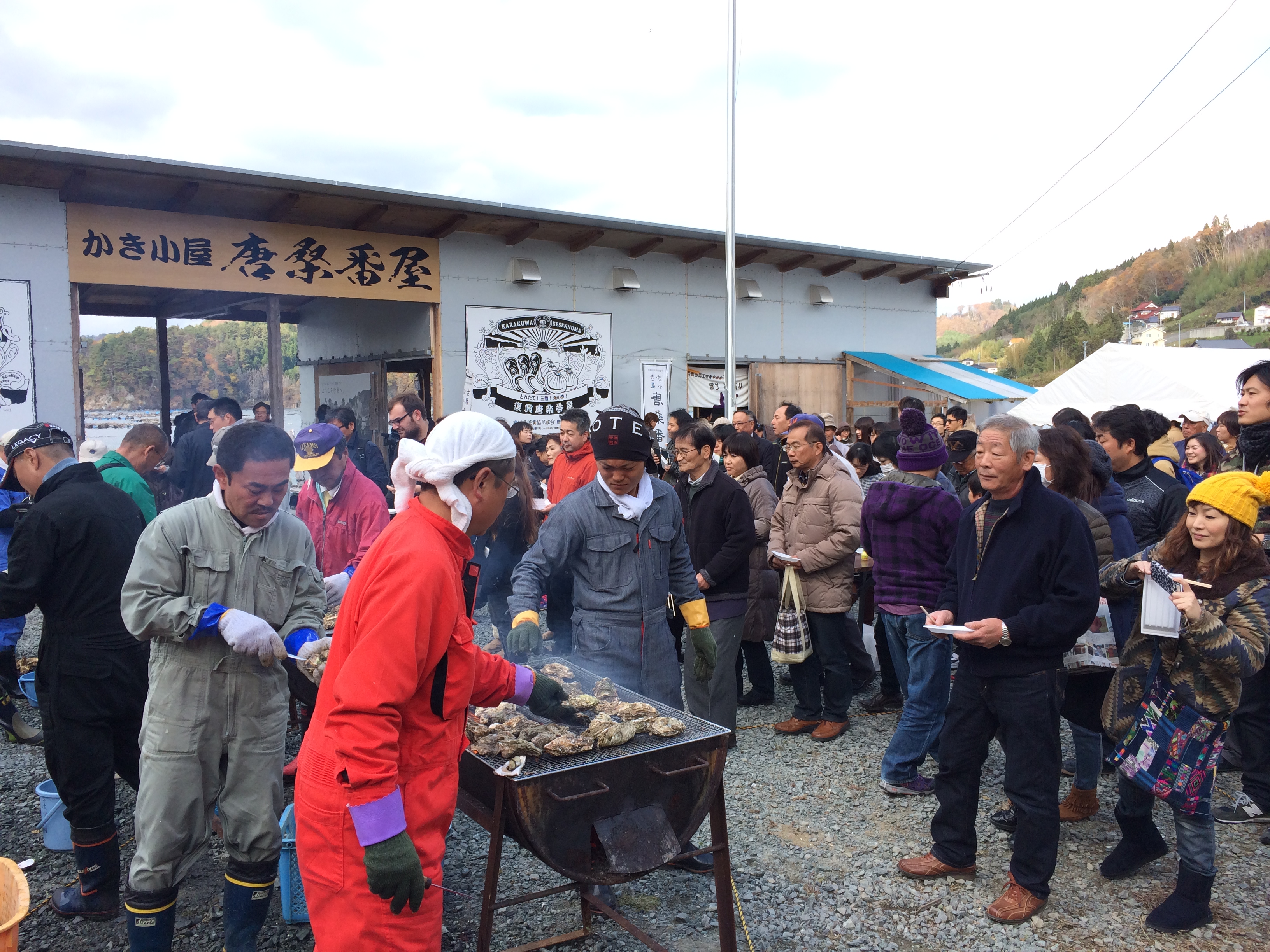 唐桑地域が盛り上がる毎年恒例のイベント、『リアス牡蠣祭り唐桑』。今年は、牡蠣いかだの浮かぶ海を望みながら、鮪立地区の特設会場にて開催されました。牡蠣の炭火焼き無料試食コーナーはもちろん、ホタテやメカジキ等の地場産品即売コーナーにたくさんの人が並んでいました。唐桑の牡蠣を求め遠くから足を運んだ方もいたようで、旬の味を楽しむお客さんで会場は賑わっていました。| 牡蠣販売の行列 | 牡蠣の炭火焼無料試食コーナー |