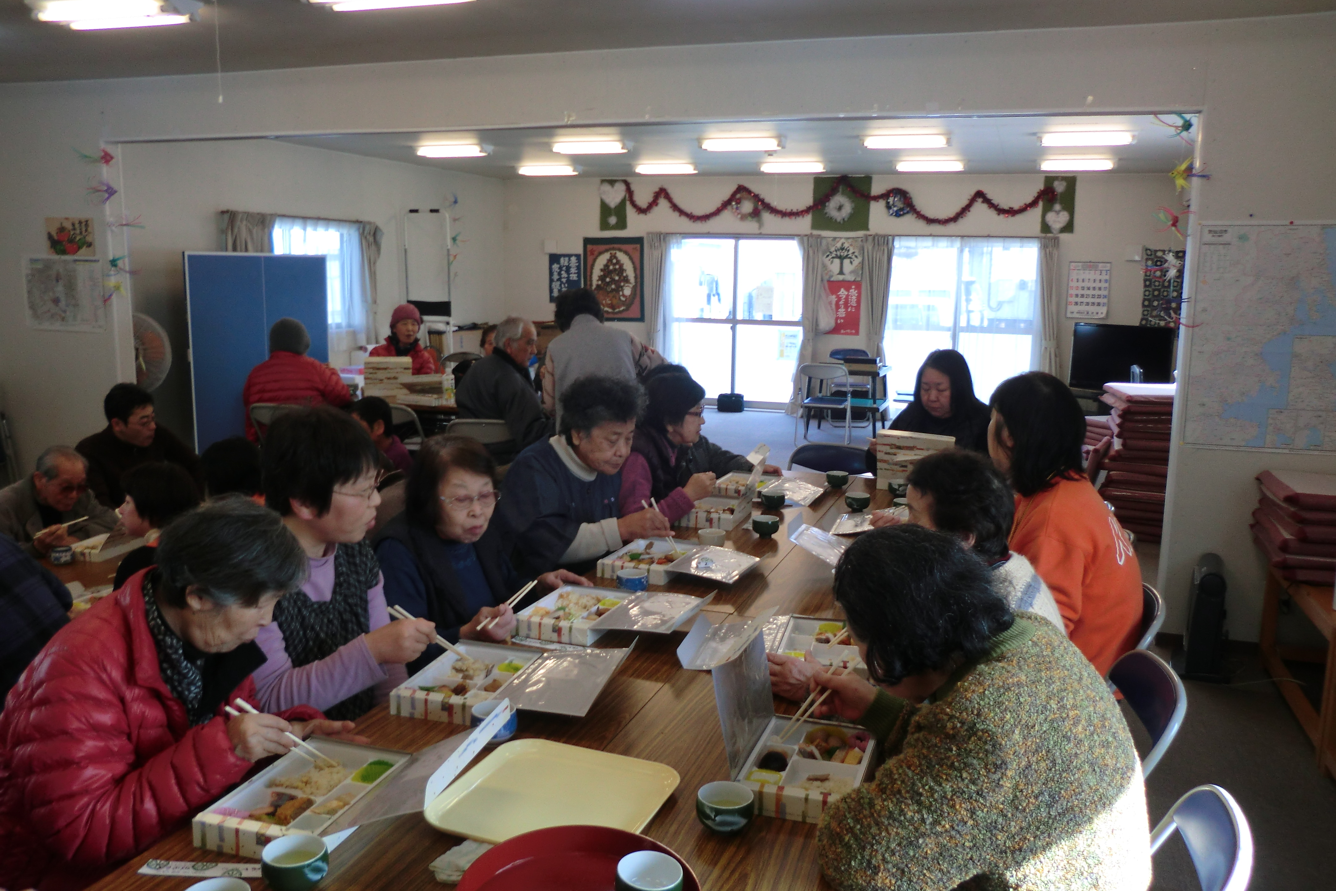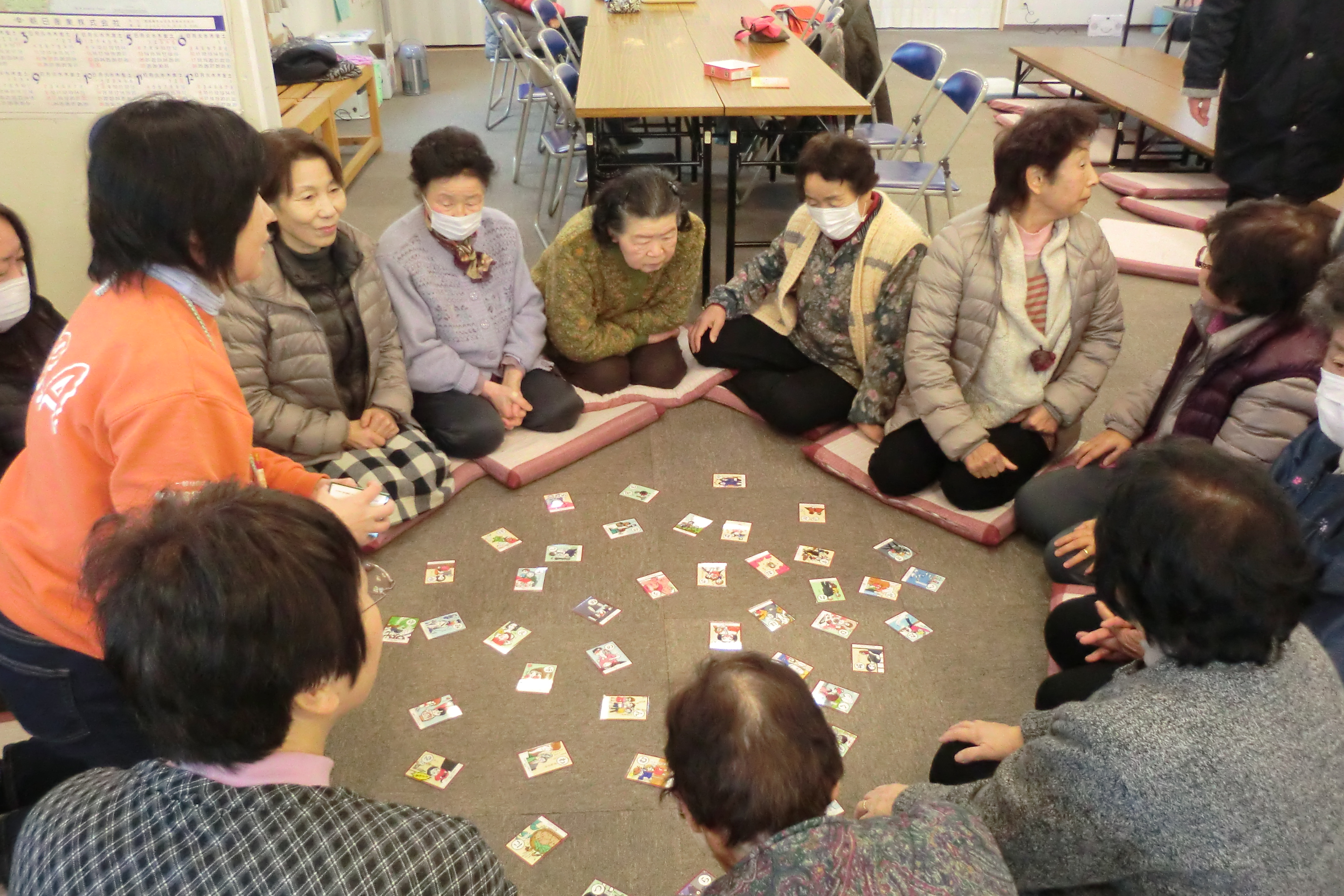 第7回「あづまっぺ趣味のじかん」が鹿折中集会場にて10時から1時まで開催されました。参加住民さんは27名です。今回は新年会として仙台弁カルタ・花札・健康麻雀・福笑い・将棋・トランプなどそれぞれ好きなゲームをして遊びました。特に、健康麻雀は男性に人気で初参加の方も見られ、昔懐かしいカルタやトランプ遊びでは、笑いが絶えず、大盛り上がりでした。たくさん笑った後は、みんなでお弁当を囲み、楽しい交流会となりました。
