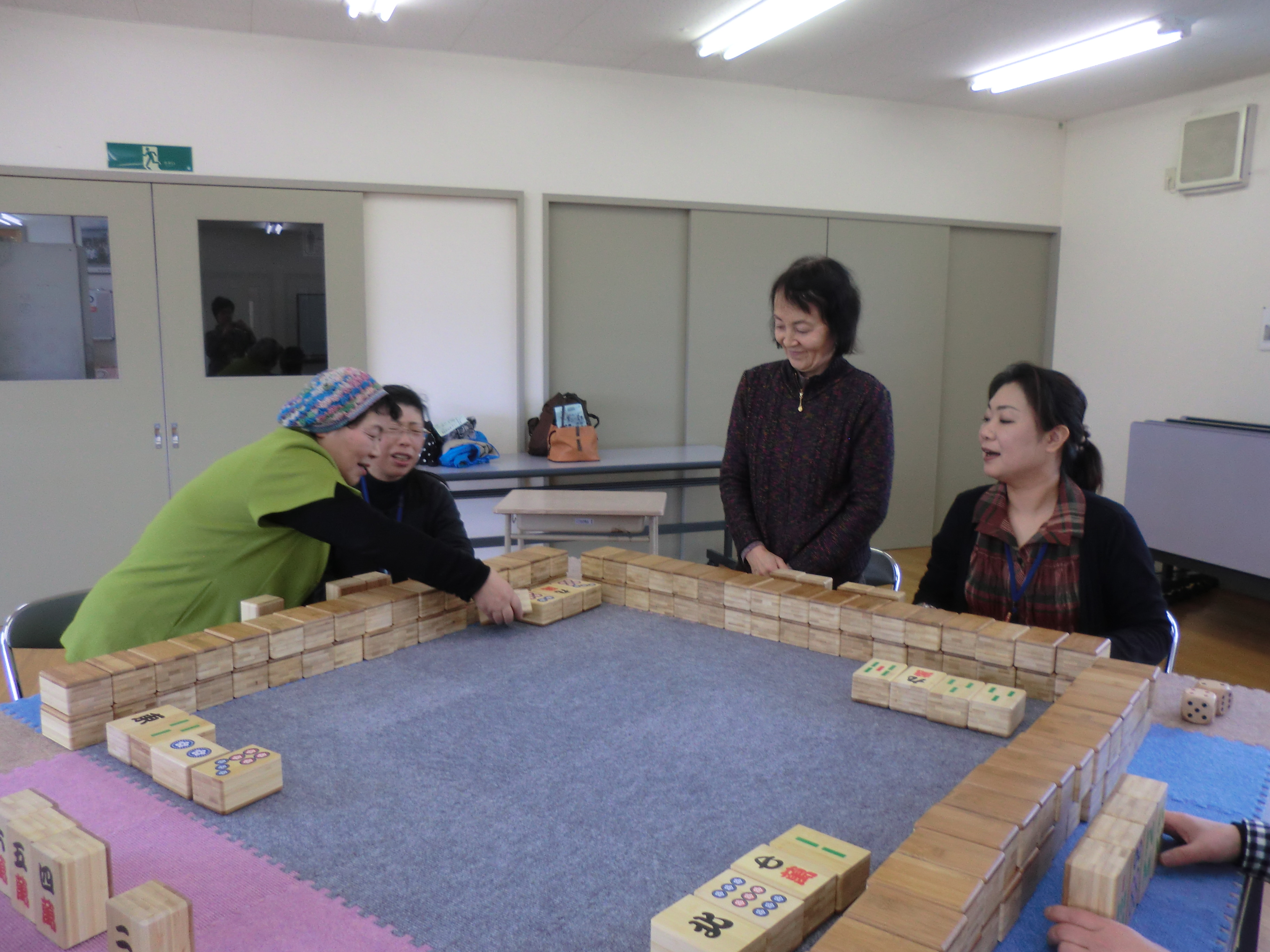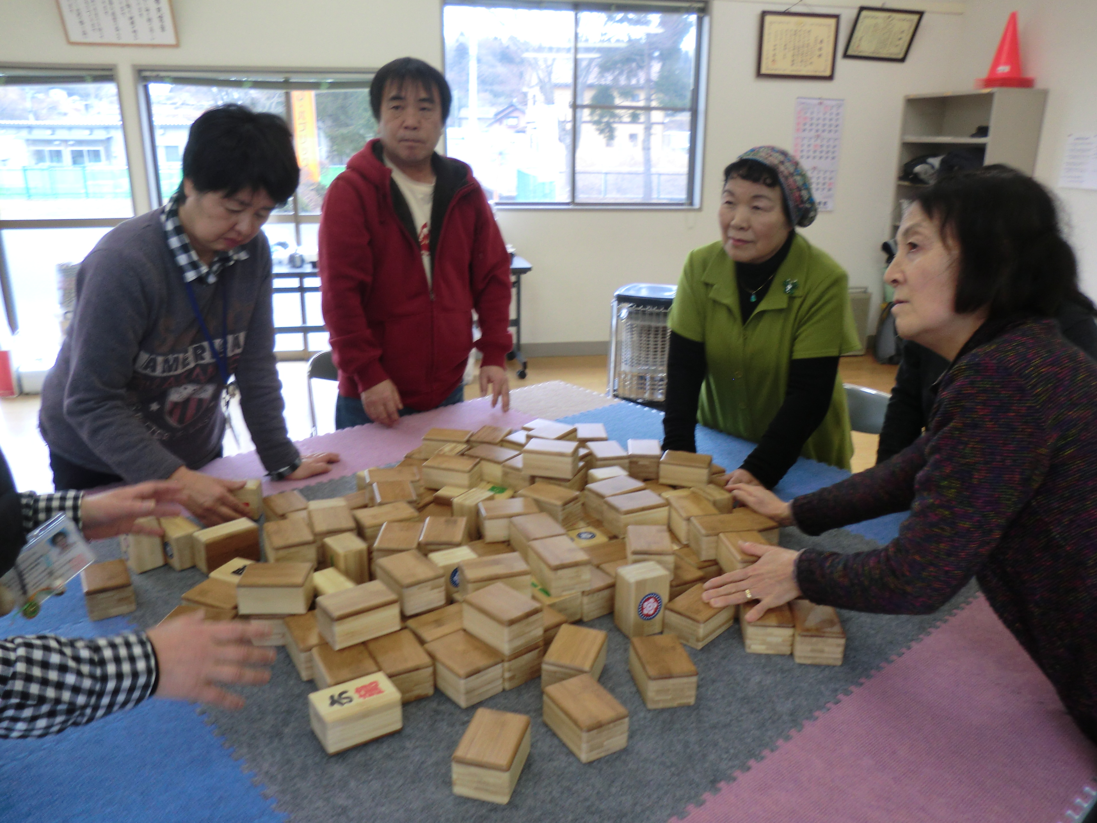 神山地区で第3回「虹カフェ」コミュニケーション麻雀を行いました。参加者全員麻雀の経験がないので、ルールの説明を真剣に聞いていました。生活支援相談員とペアで話し合いながら、ゲームを楽しみました。お茶の時間には自治会の活動について話し合いを行なったり、少ない人数でしたが有意義な時間を過ごしました。