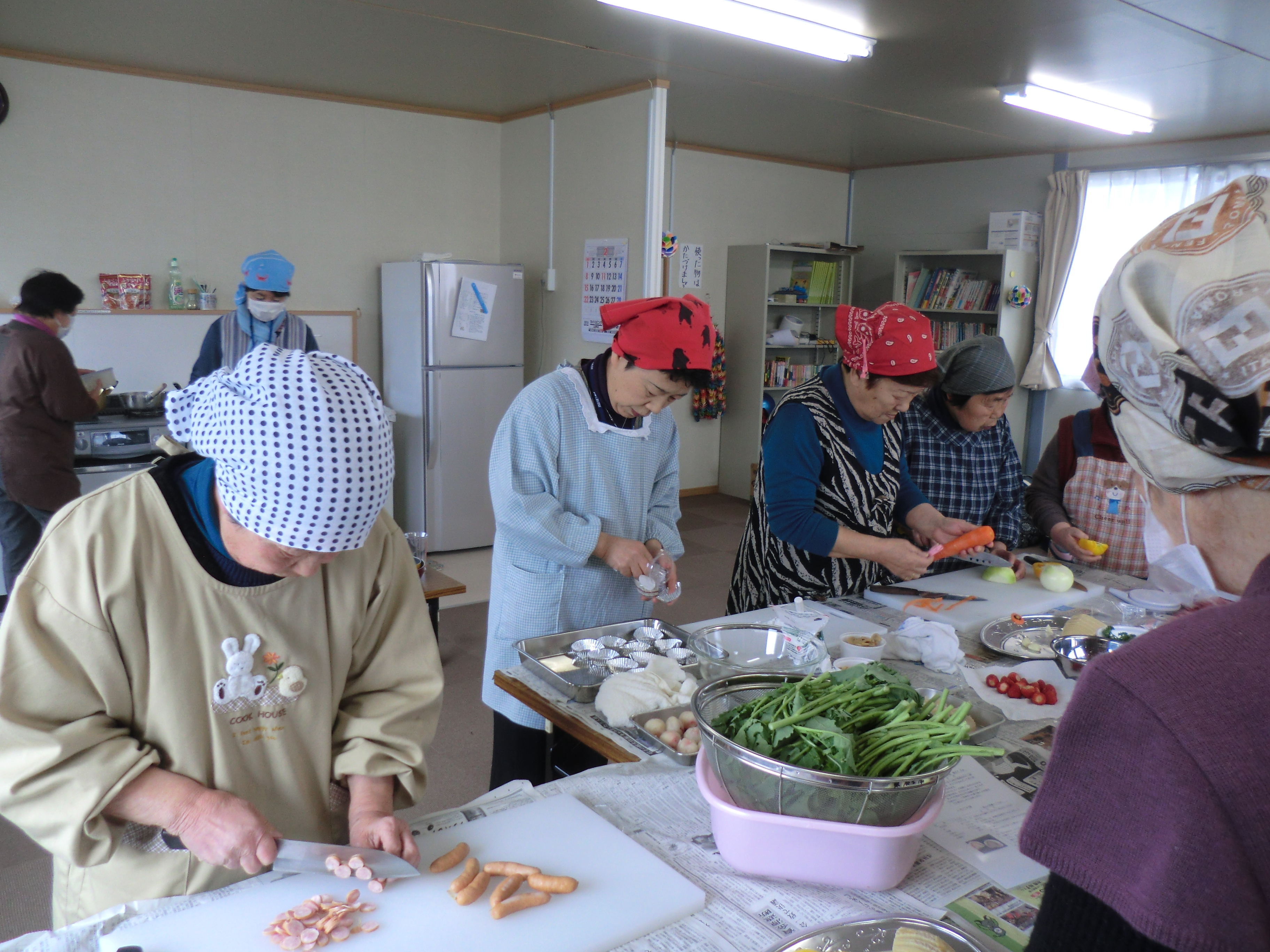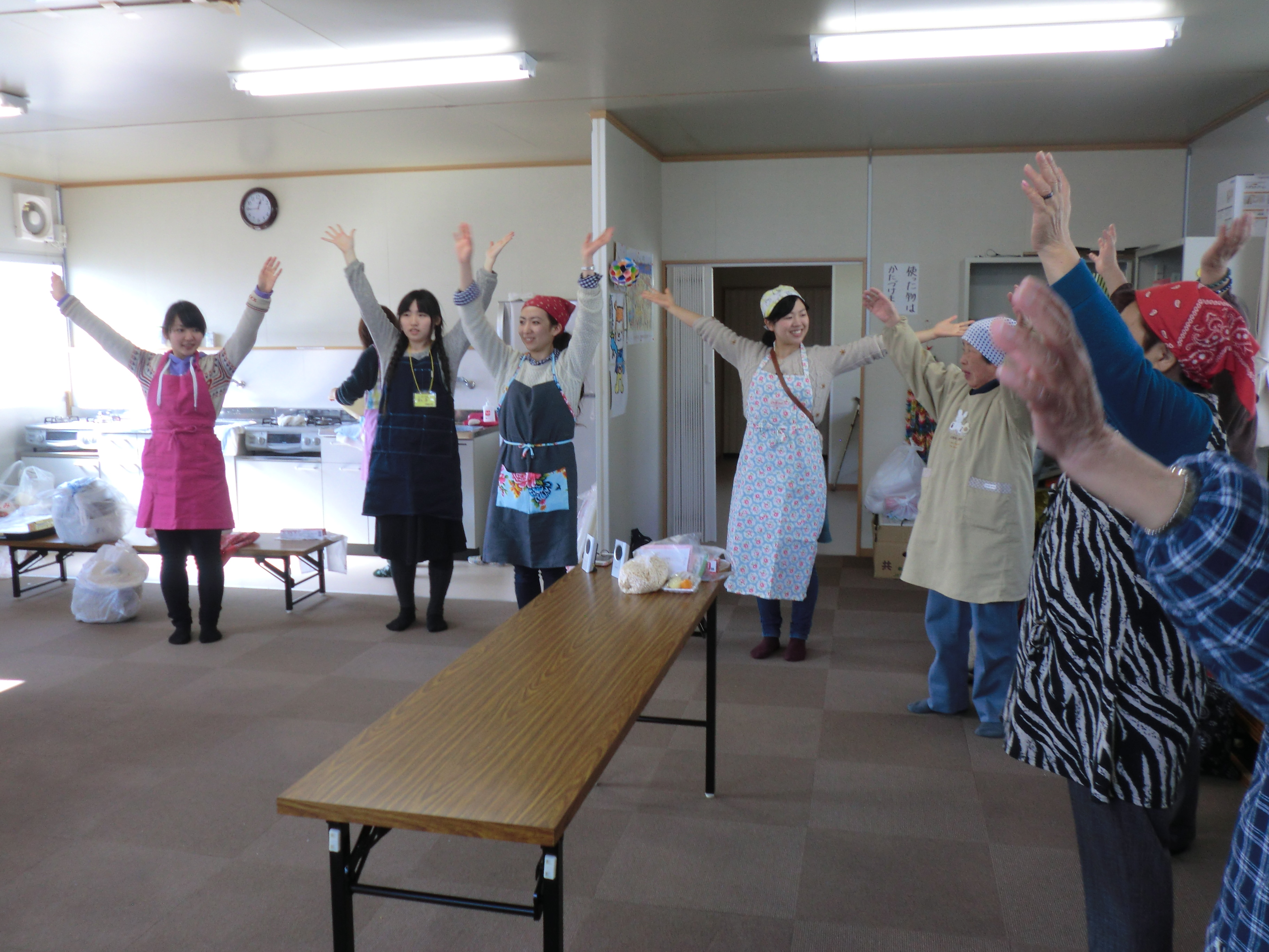 松岩中学校仮設住宅集会所で気仙沼栄養士会の料理教室が開催されました。恒例の、みそ汁の塩分比較体験では皆さんが減塩で健康を維持している薄味嗜好でした。 元気で明るい笑顔の学生ボランティアが健康体操を行い身体を動かしたので生活不活発予防になりました。