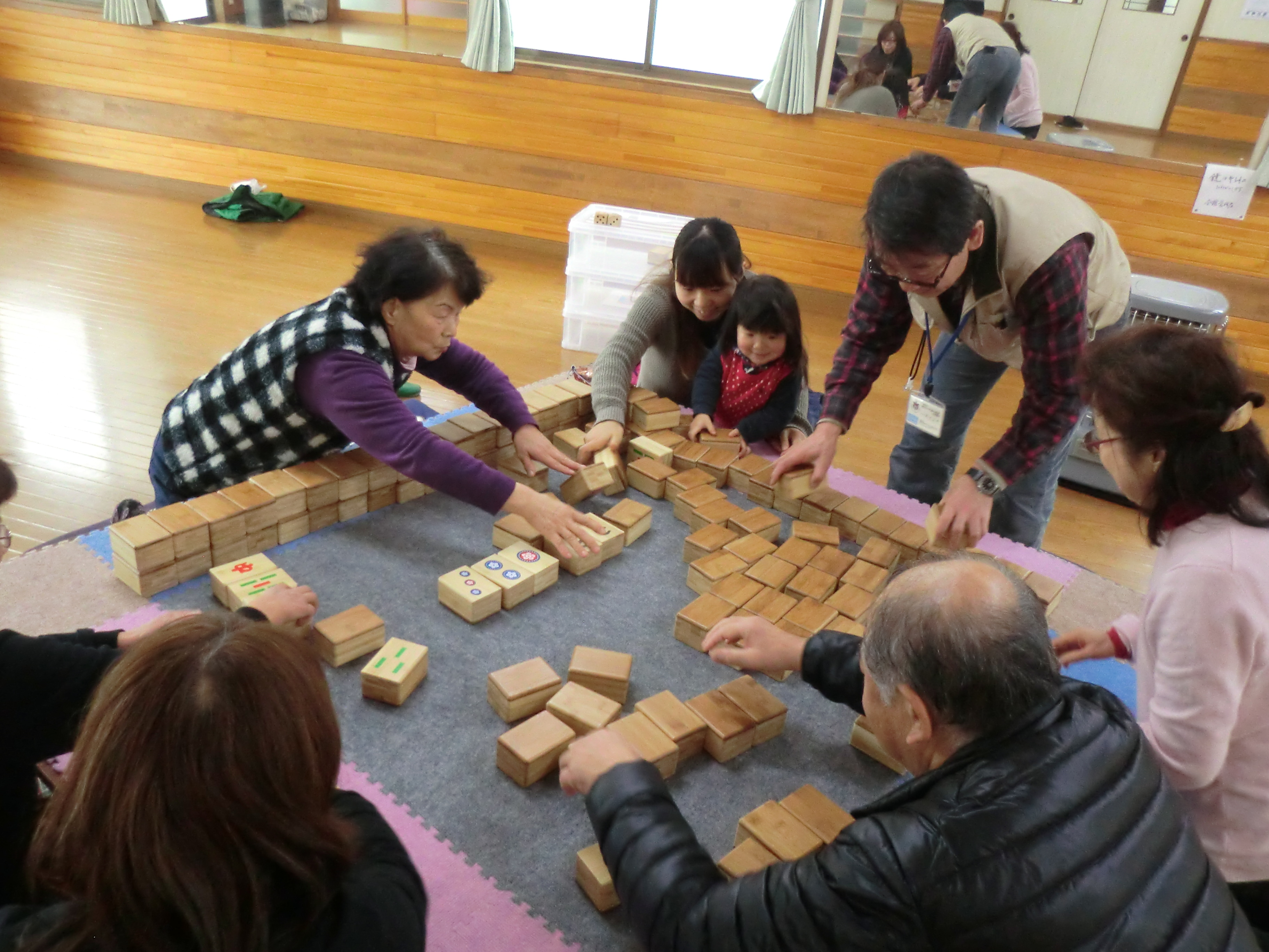 田中4区自治会館で虹カフェが開催されました。コミュニケーション麻雀に興味があり参加した方もいれば、体操をしたくて来てみたという方もいらっしゃいました。いつも、お母さんと一緒に参加する女の子も、積み木のような麻雀パイに興味深々の様子でした。