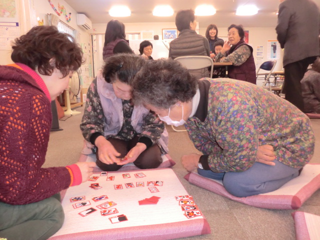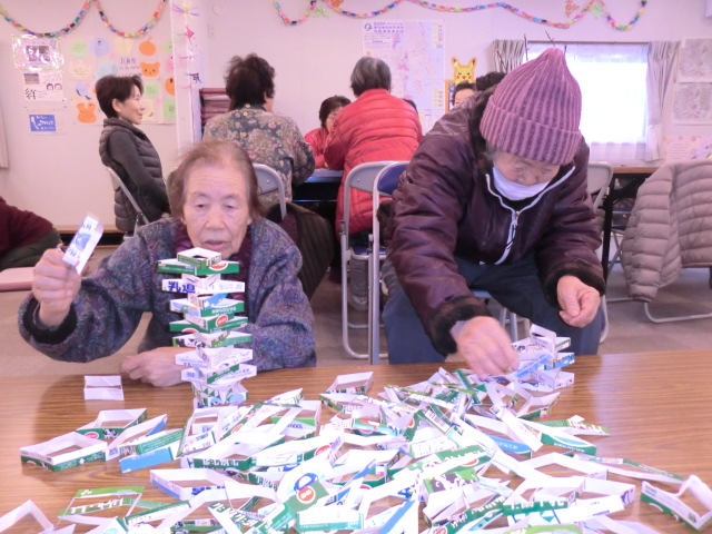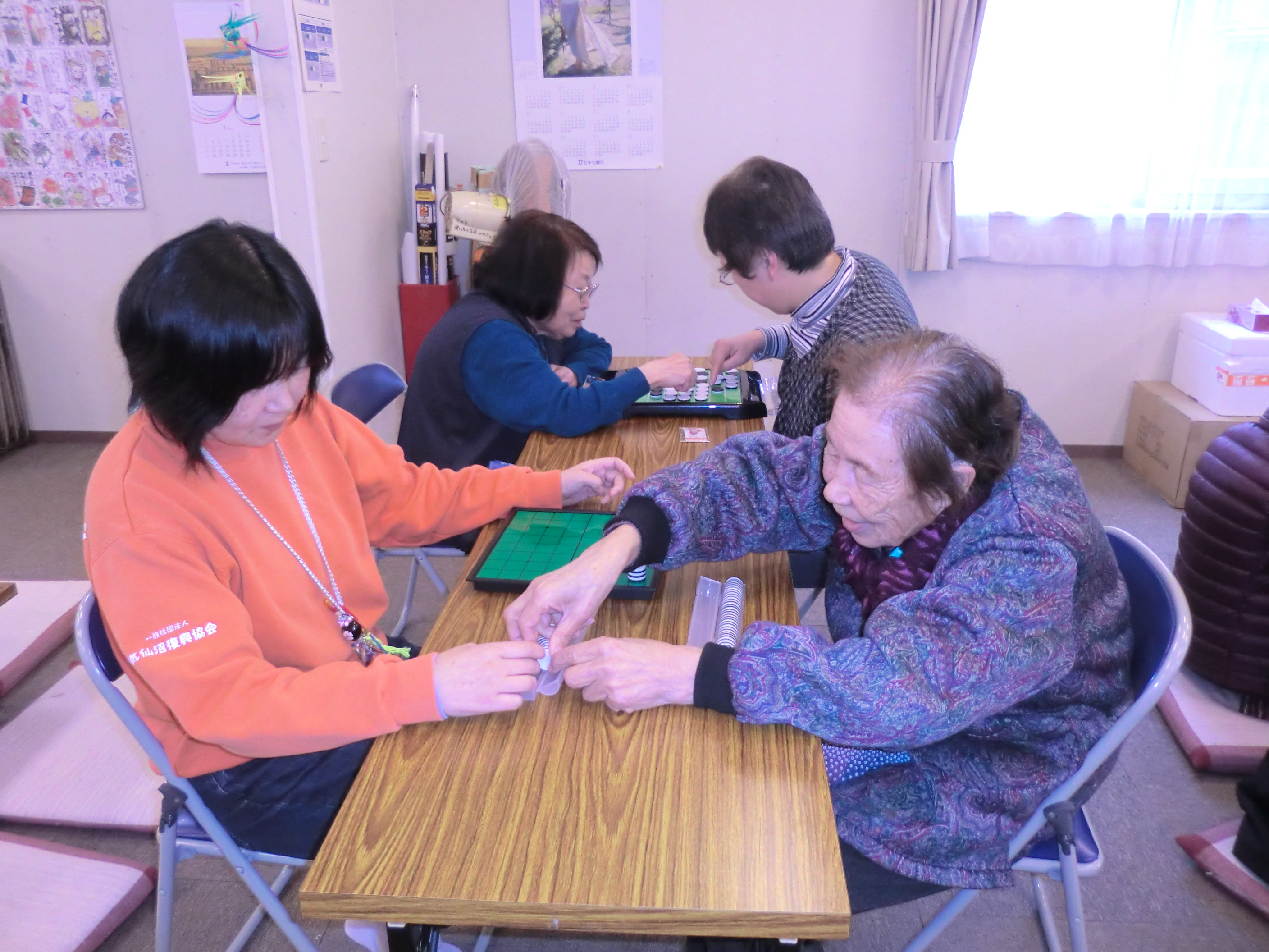 第8回「あづまっぺ趣味の時間」は前回がとても好評だったので、今回も健康麻雀や花札、トランプなどを楽しみました。カラオケと牛乳パック積み重ねゲームも新たに加わり前回同様、大変盛り上がる事ができました。お弁当を食べる時間になってもまだ、麻雀を続ける程夢中になり、皆さんがそれぞれ好きな時間を過ごしリフレッシュされた様でした。