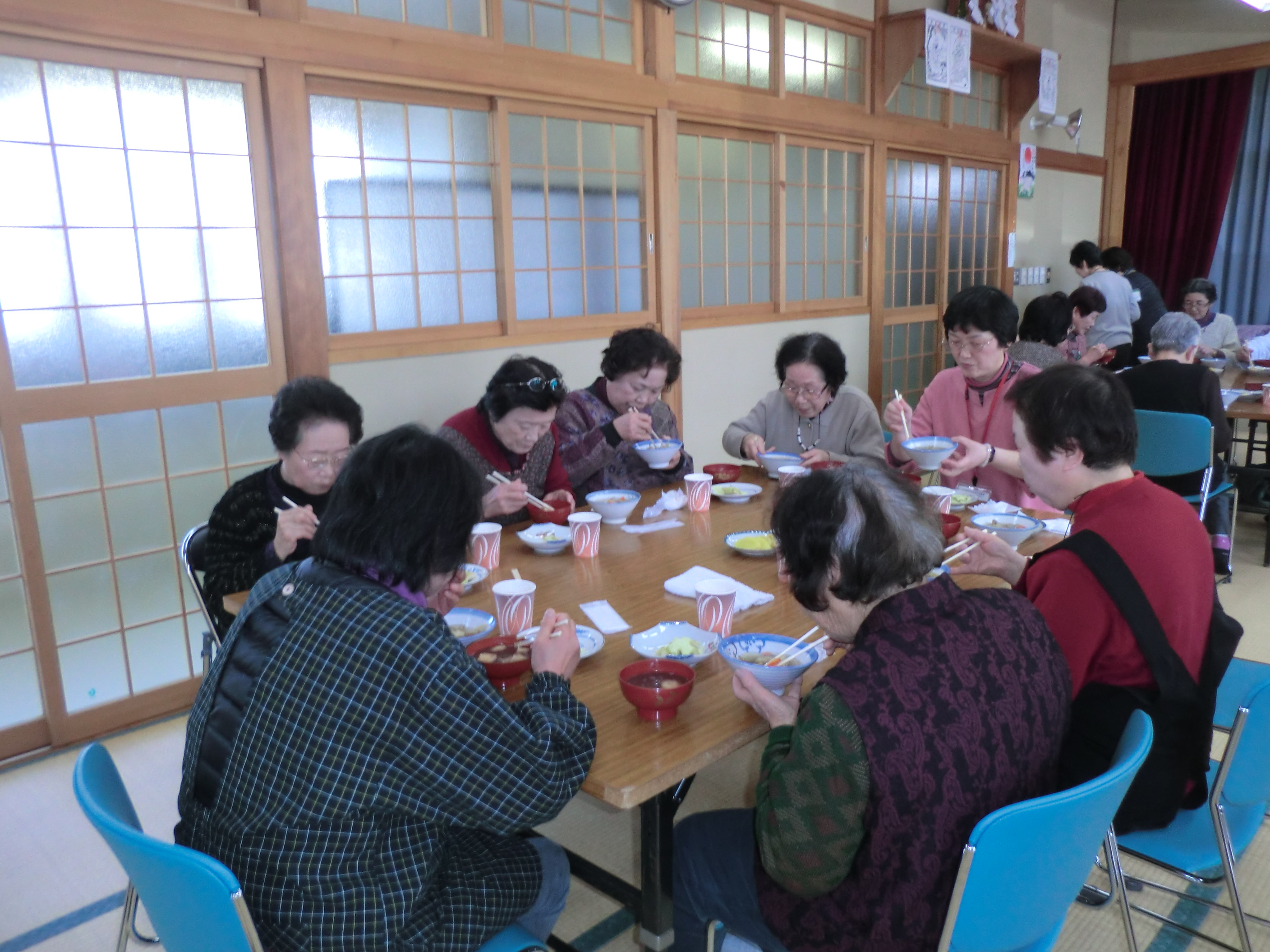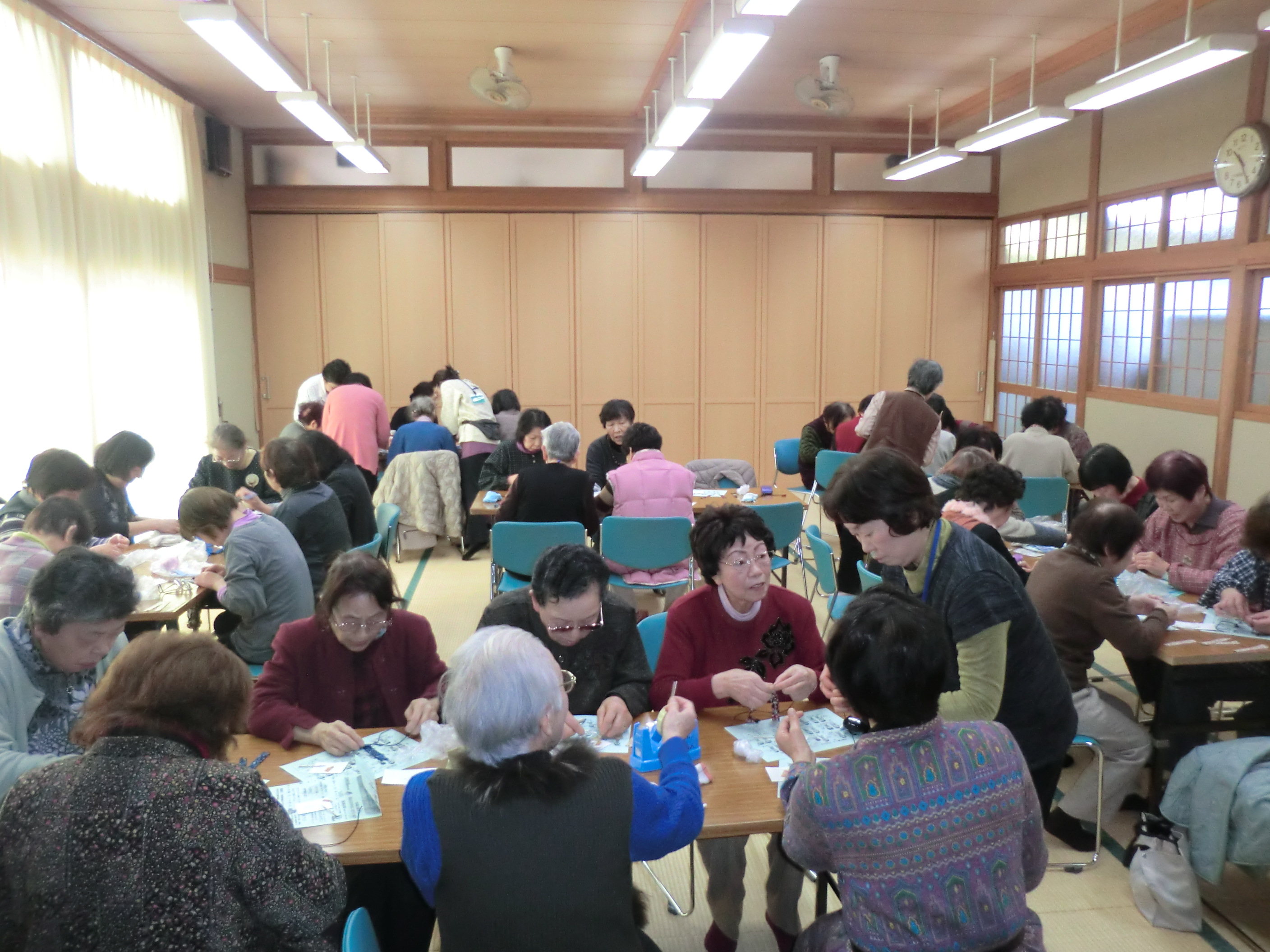 今年度4回目の上地区社会福祉協議会主催「絆喫茶」が開催されました。今回は男の料理教室と銘打ち、はっと作りに挑戦しました!!男性陣の料理が完成する間、女性陣はお茶っこ体操、手遊びなどで身体と頭をリラックスさせました。その後、ハギレとウッドビーズやとんぼ玉でネックレス作りを楽しみました。男性陣がテーブルセッテングから配膳を行い、女性陣は美味しい料理を頂きお雛様気分で楽しい会食の時間を過ごしました♪♪本日の参加者は67名と過去最高で大盛況でした。