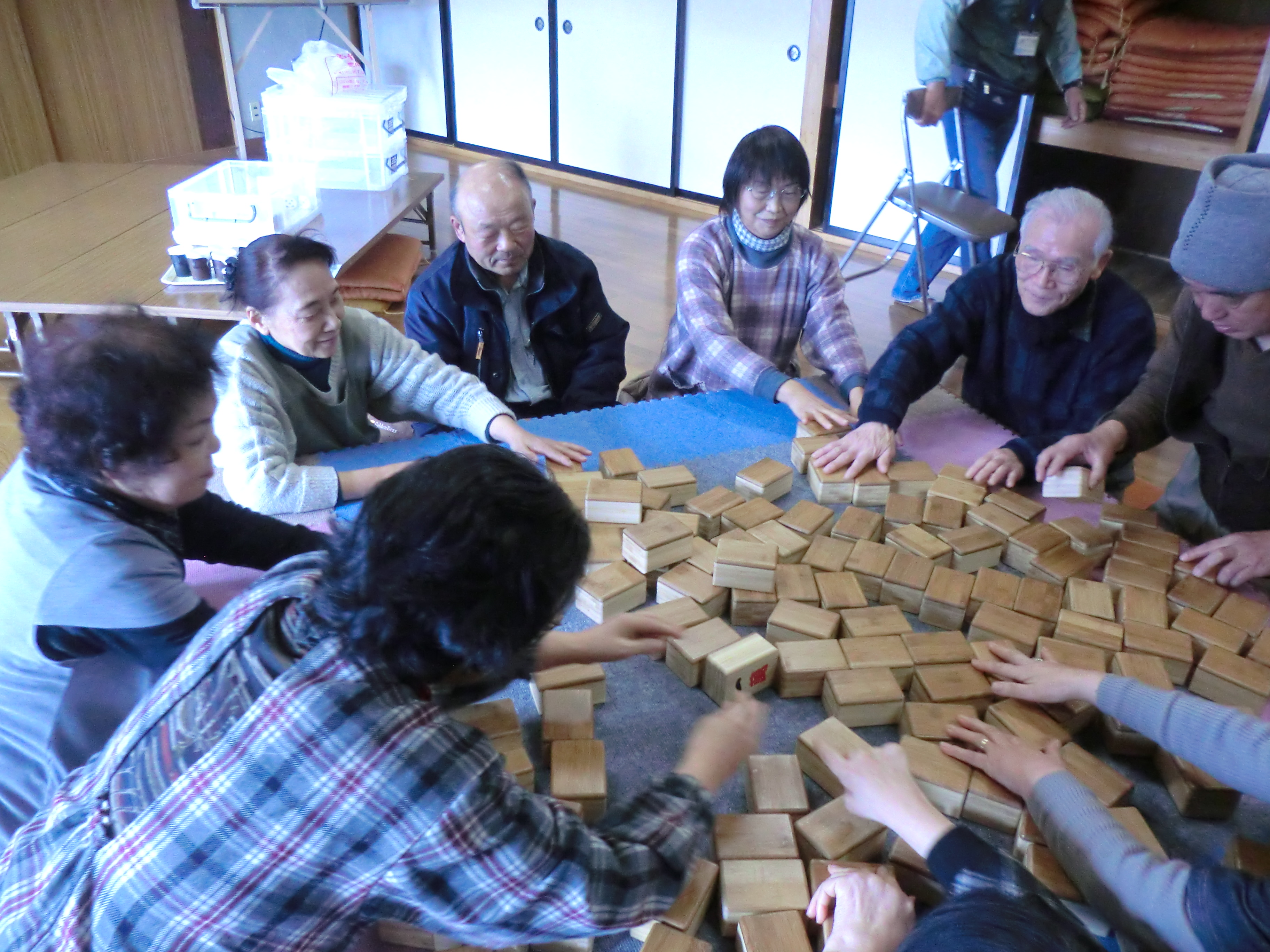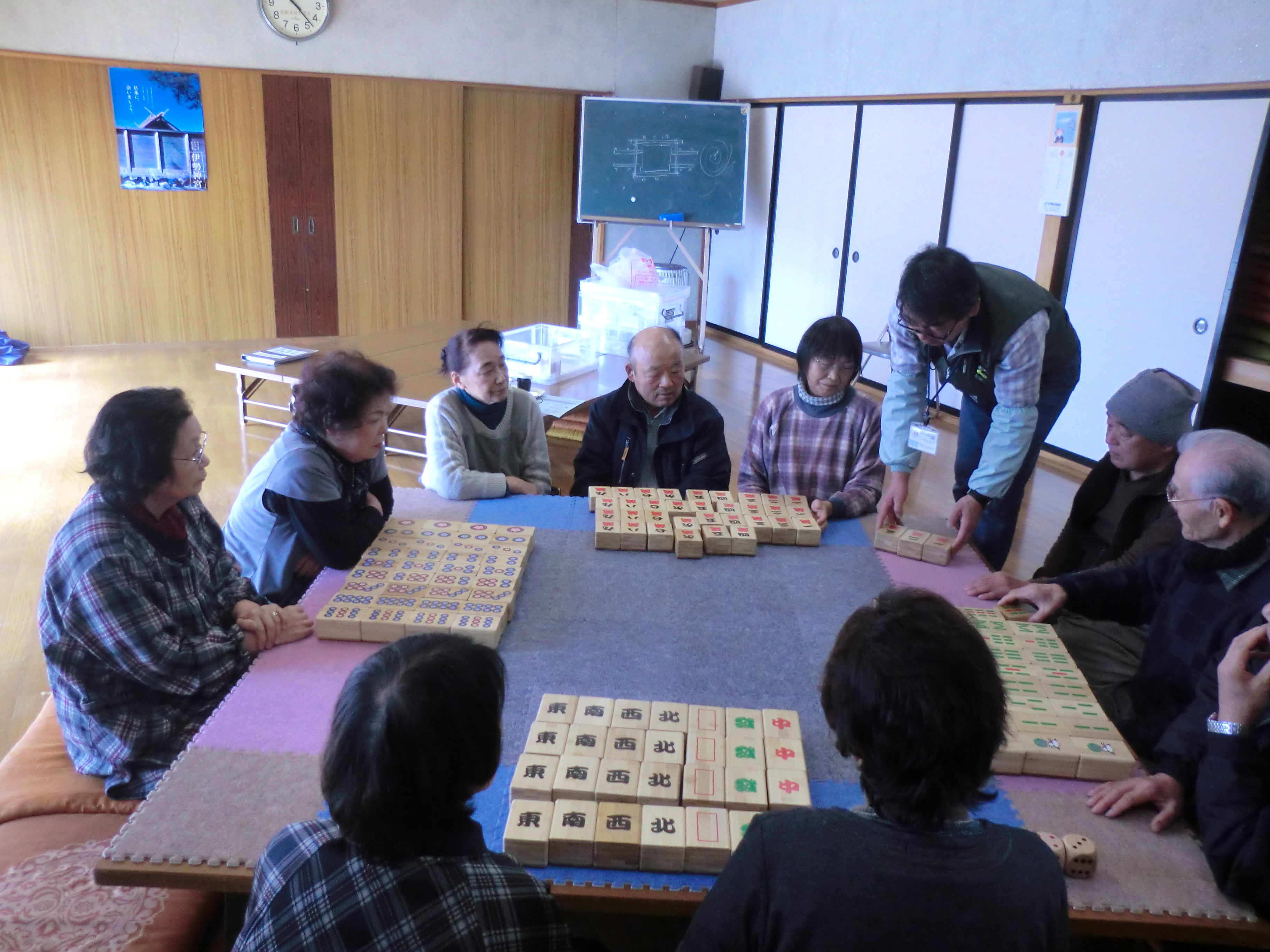 九条5区でコミュニケーション麻雀を行いました。この地区では麻雀が初めてという方が大半でした。しかし、お互いに声を掛け相談しながらゲームを重ねるうちに、皆さん夢中になり、無口だった方もだんだんと話し出すなど、会場には笑いが響き「自治会活動の中でもコミュニケーション麻雀をしたい!」という声が挙がっていました。