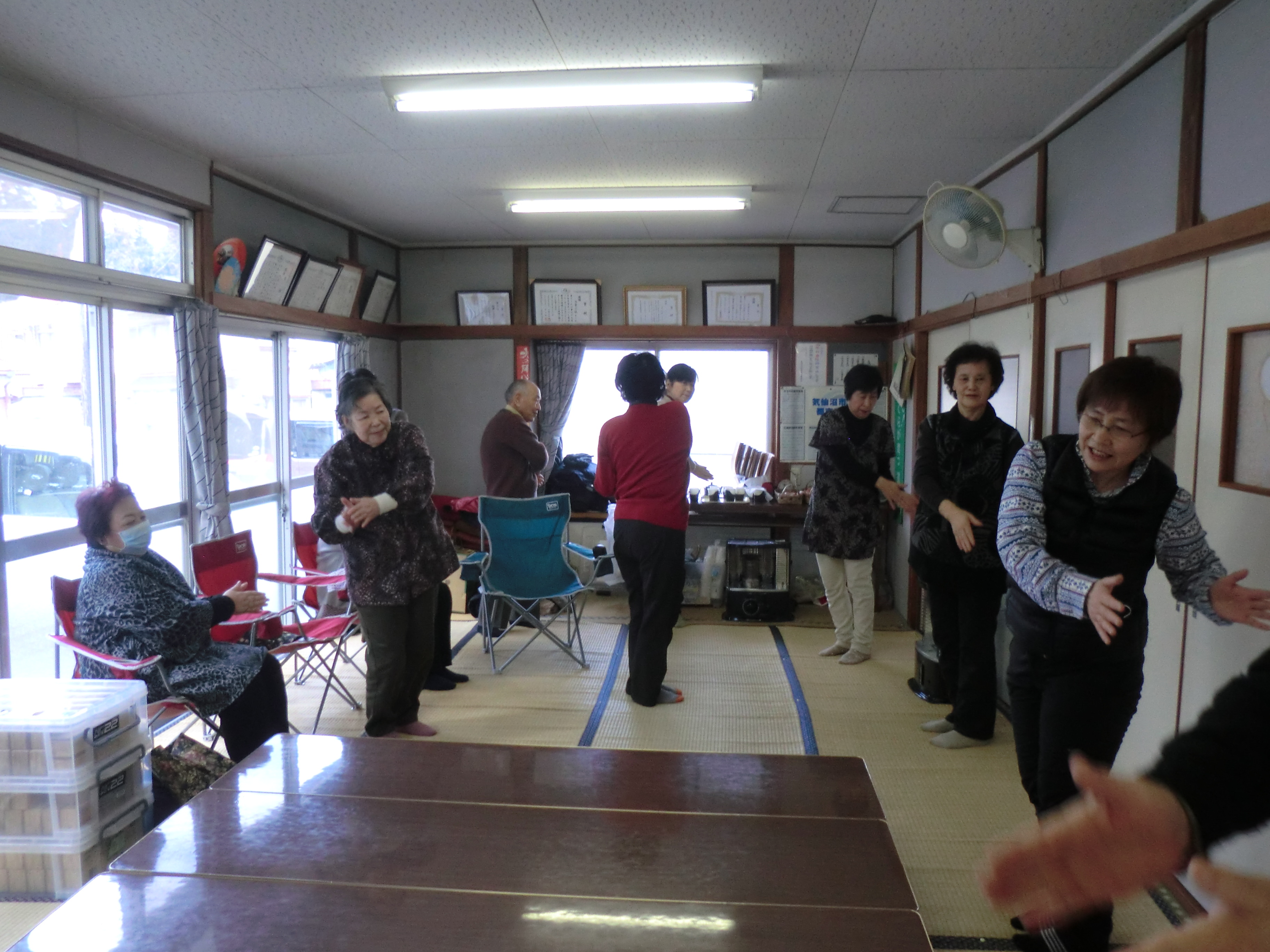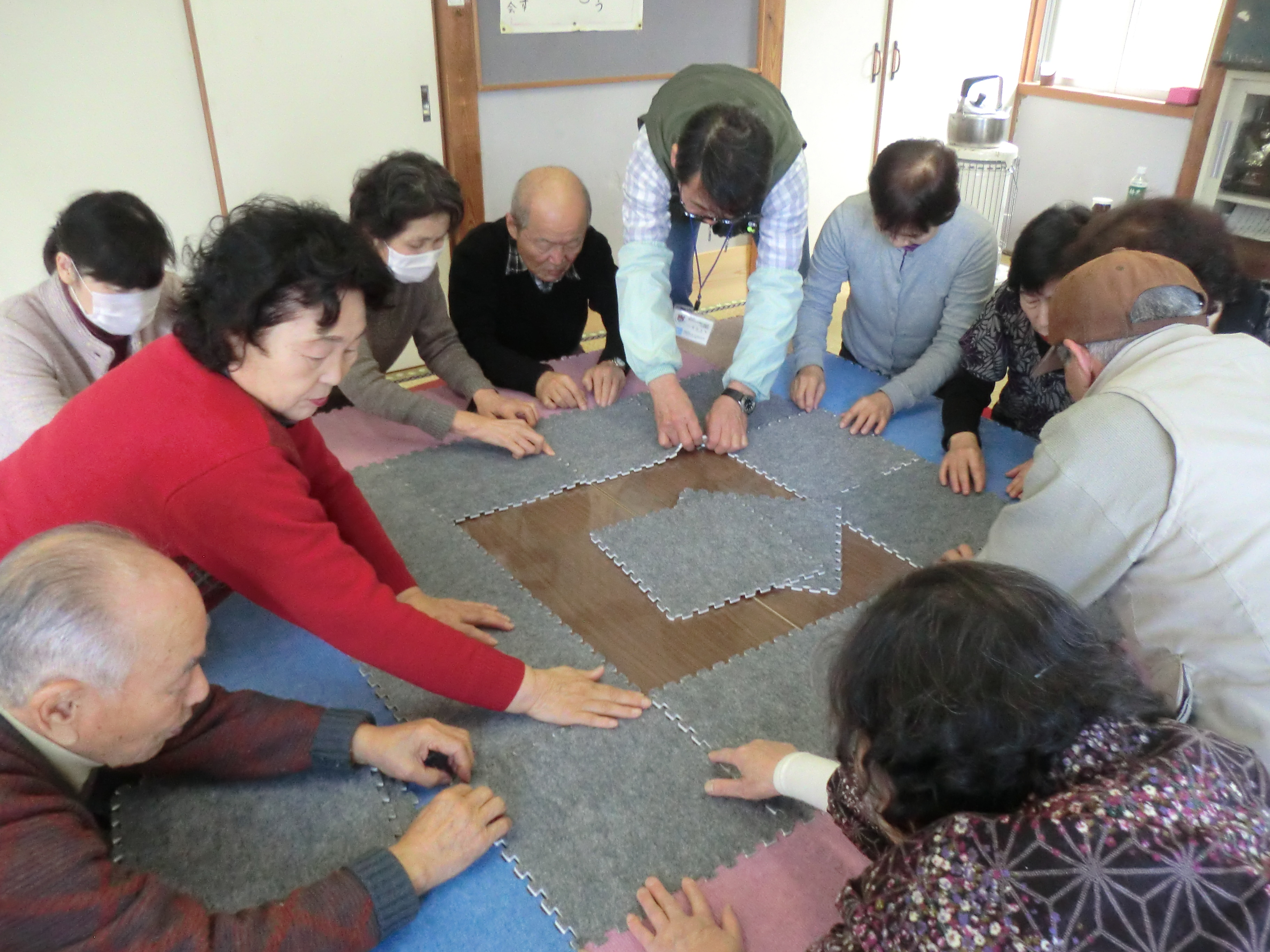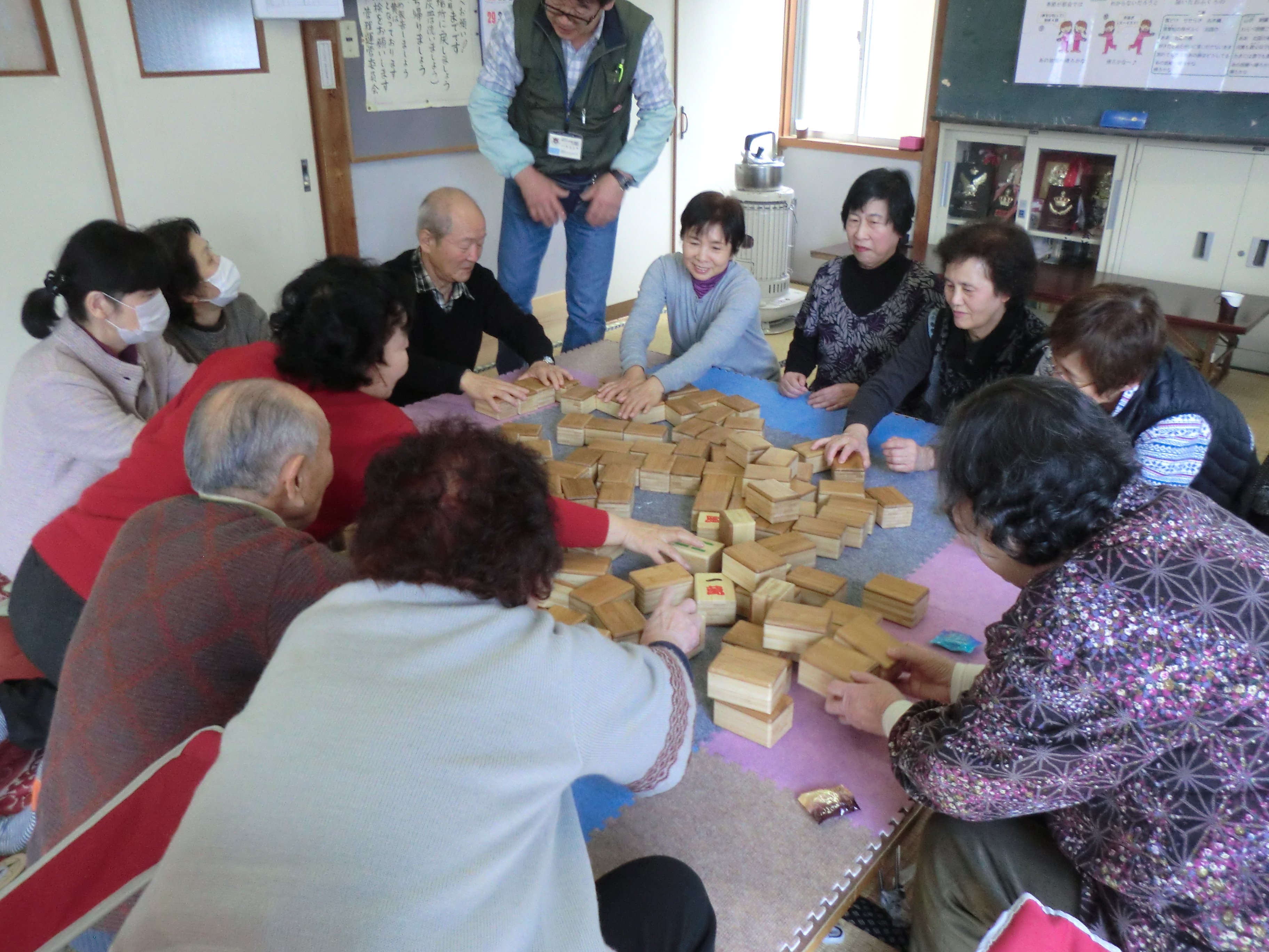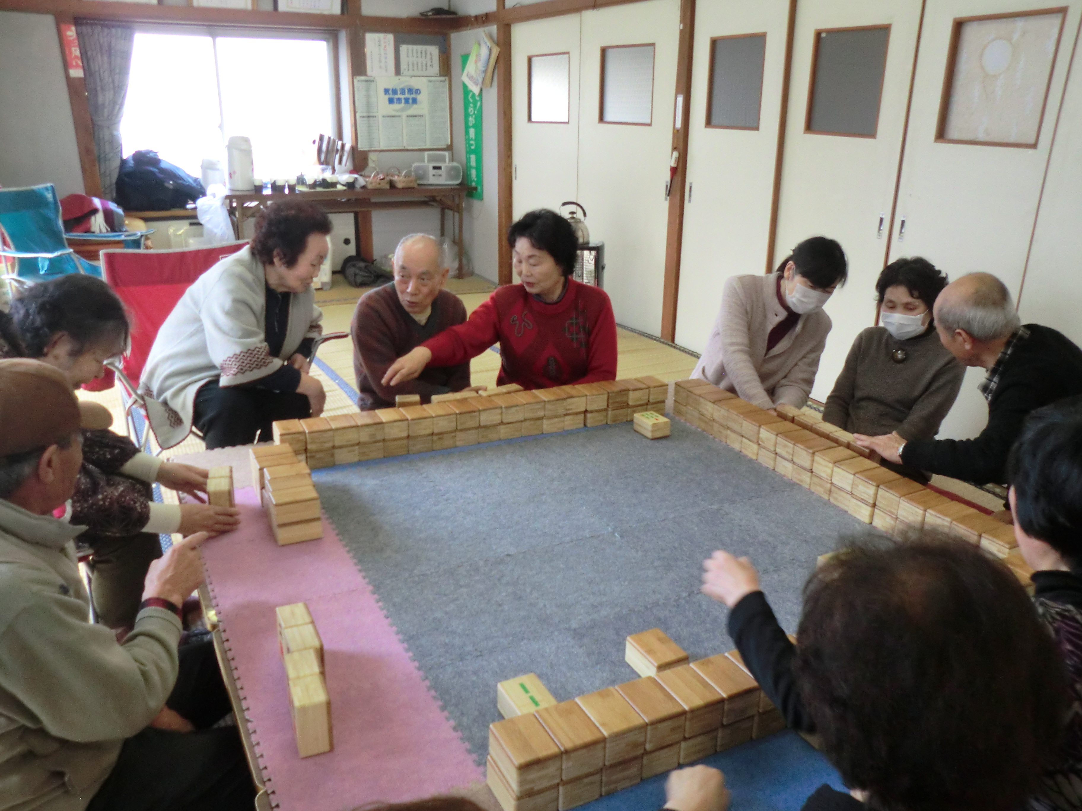 九条3区でコミュニケーション麻雀を行いました。本日の参加者は12名だったので、丁度3名づつの組になり行いました。皆さん覚えが早く、会の半ば頃には持ち駒を4個から7個にして行いたいとの要望があり駒を多くしてゲームを楽しみました。他の地区と同様に九条3区でも、コミュニケーション麻雀の評判は良く、「定期的に行いたい」「週1回位でやりたい」といった感想が聞かれたり、この麻雀セットを購入したい!という意見まで出ていました!!