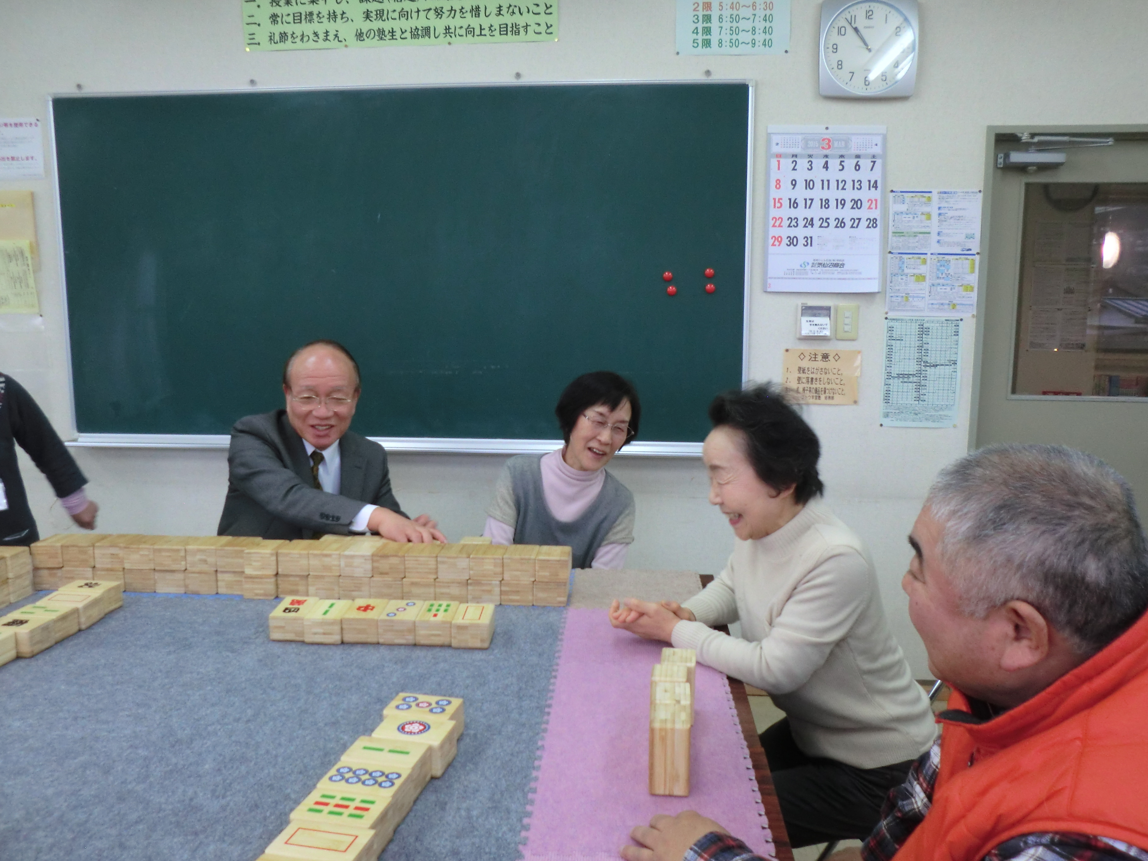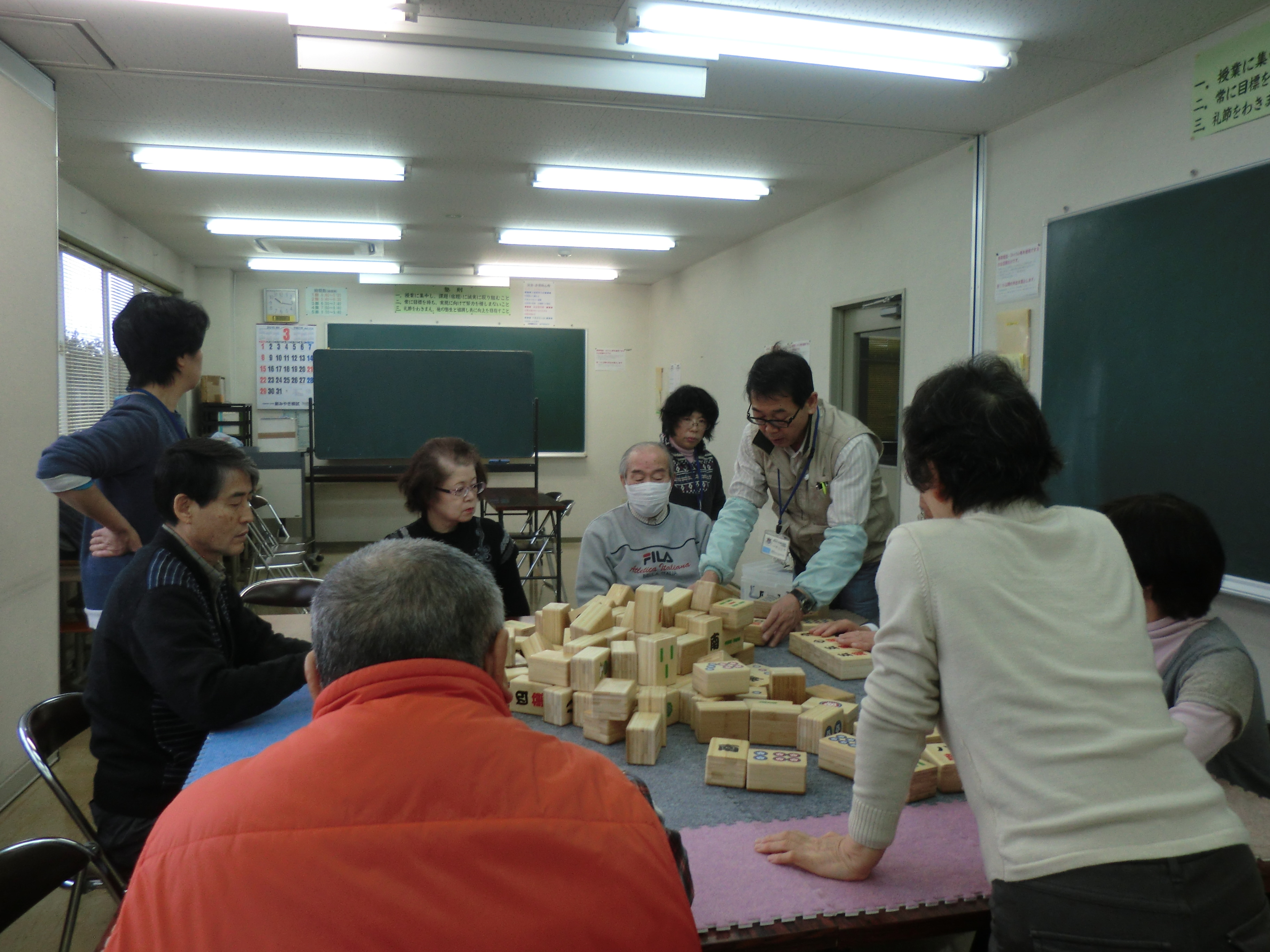 九条1区でコミュニケーション麻雀が行われました。こちらの地区では丁度、男女ペアが4組出来ました。男性陣が麻雀経験者の方々だった為、スムースなゲーム運びでした。せっかくの交流会ですから、他の方とコミュニケーションが取れるよう、第3回目の虹カフェでは、ご夫婦で参加された方は同じチームにならないようにと、別れてペアを組んで頂いています。