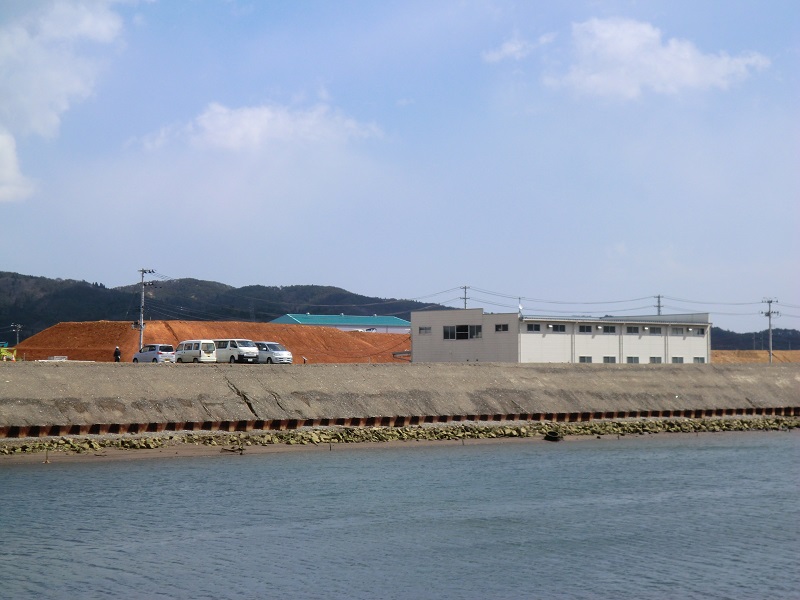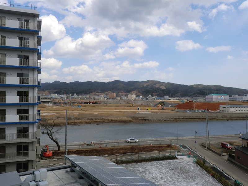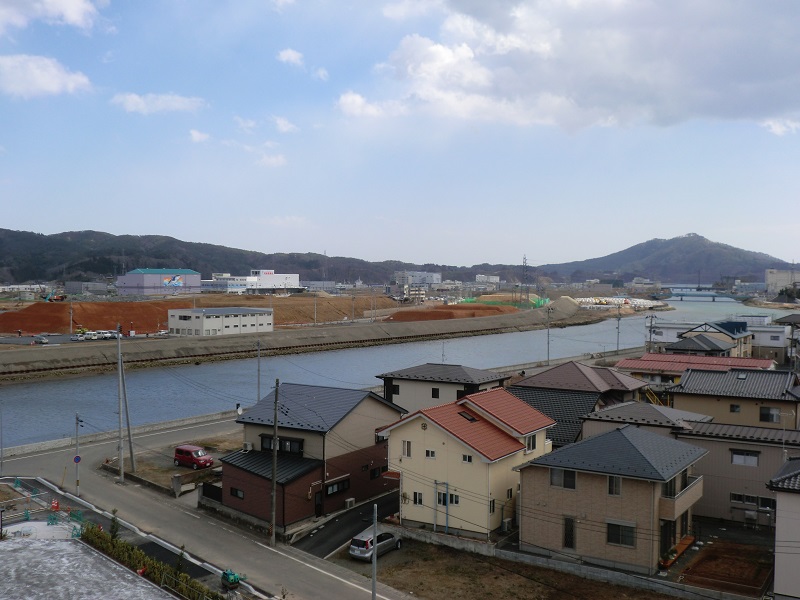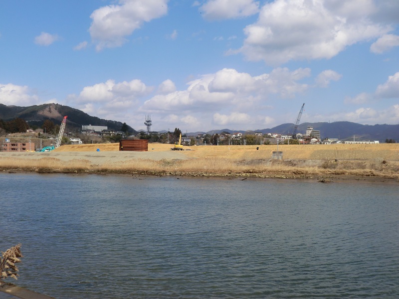 市営南郷住宅から大川越しの内の脇方面を撮影しました。同じ被災地でも、建物を撤去し嵩上げ造成工事を行う事になった南地区と、嵩上げ工事はせず建物を直して住める事になった南郷地区の風景とでは、大川を挟んで全く違う姿が見られます。