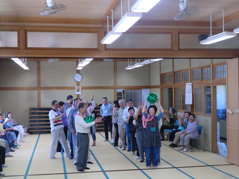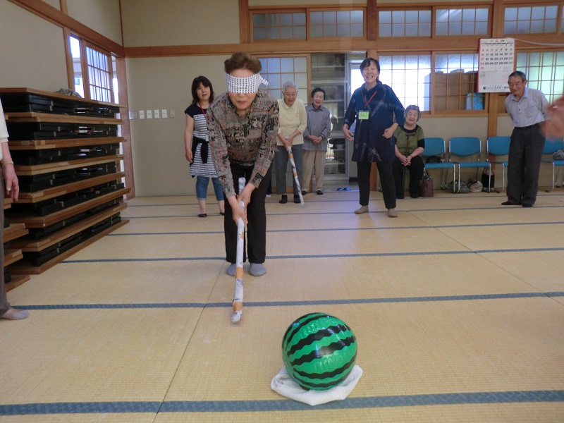 上地区社会福祉協議会主催の、今年度初になる「絆喫茶」には、みなし仮設にお住まいの方7名の参加があり、グランドゴルフ・スイカ割り・バドミントンラケットを使ったボール運び等のミニスポーツでは、拍手や歓声が上がり大いに盛り上がりました。私達も「絆喫茶」では恒例になった「いけいけお茶っこ体操」を行ってきました。
