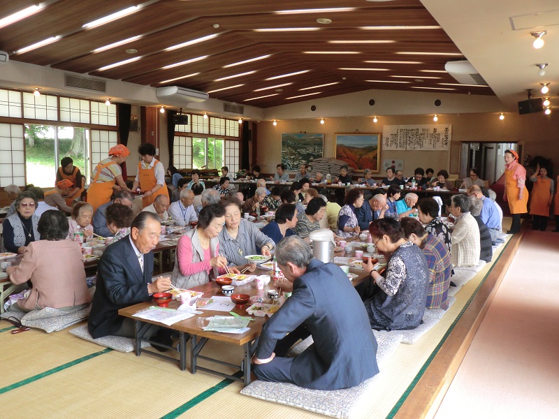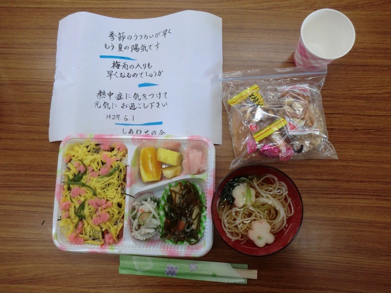 晴天に恵まれ初夏を感じさせる中、西地区ボランティア「しあわせの会」主催による新緑を愛でる会が開催されました。会員手作りの彩りよい“ちらし寿司”のお弁当には手書きでメッセージが添えられ、お腹も心もいっぱい!その後は会員の皆さんや参加者の方々のアトラクションが行われ、煌めく新緑よりも皆さんの笑顔が輝いていました。