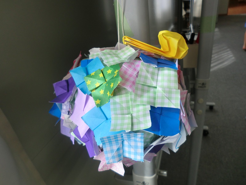 今回は折り紙で今の季節の花「アジサイ」作りにチャレンジしました。早稲田の学生さんが住民さんに花びらの折り方を教え、一片ずつ折っていきます。その花びらを集めて組み合わせ「アジサイ」が完成!