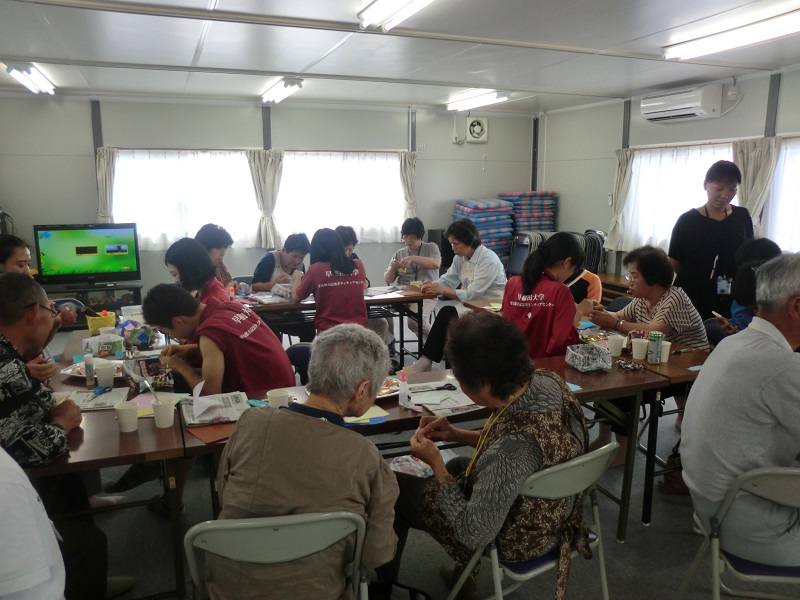 参加者の男の子は男子学生相手に紙飛行機を飛ばしたり、卓球をしたりと思いっきり身体を動かしていました。高齢の方達は合間にお茶を頂きながら「指先を動かすと頭の体操になるね」と話しながら様々な色の花びらを作っていました。