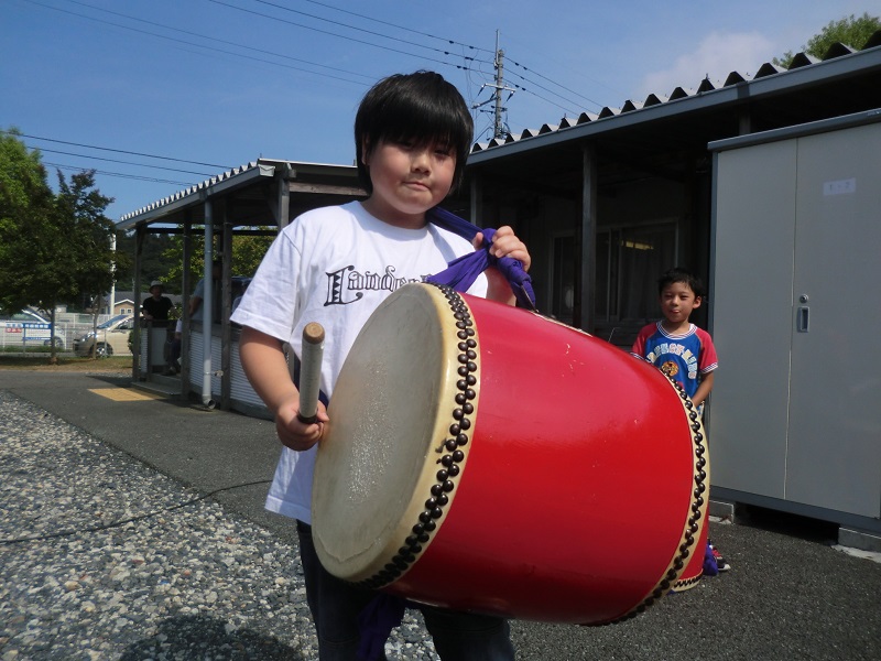 | スカウトされてるのかな?? | 沖縄気分の青空の下、 太鼓を抱えて「カッコいい!!」 |
