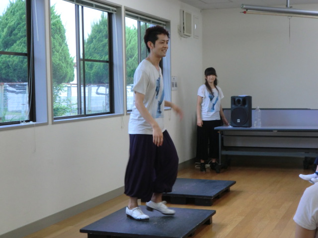 初めに、フライハイトの主宰であるLilyさんからタップの足運びを教わり、フライハイトの生徒さんや中央大学のタップダンスサークルの学生さんたちとグループに分かれてタップを踏んだり手拍子をしながら楽しくふれあいました。休憩時には参加された方の間にスタッフが入り、水分補給をしながら会話に花を咲かせていました。また、幼児の参加もあり、スタッフが一緒に遊ぶ姿を皆さん微笑ましく見ていました。