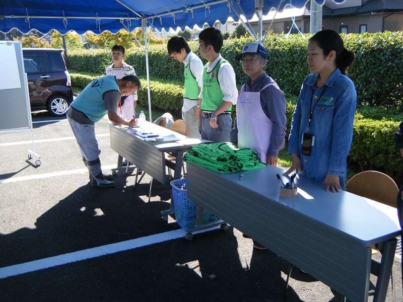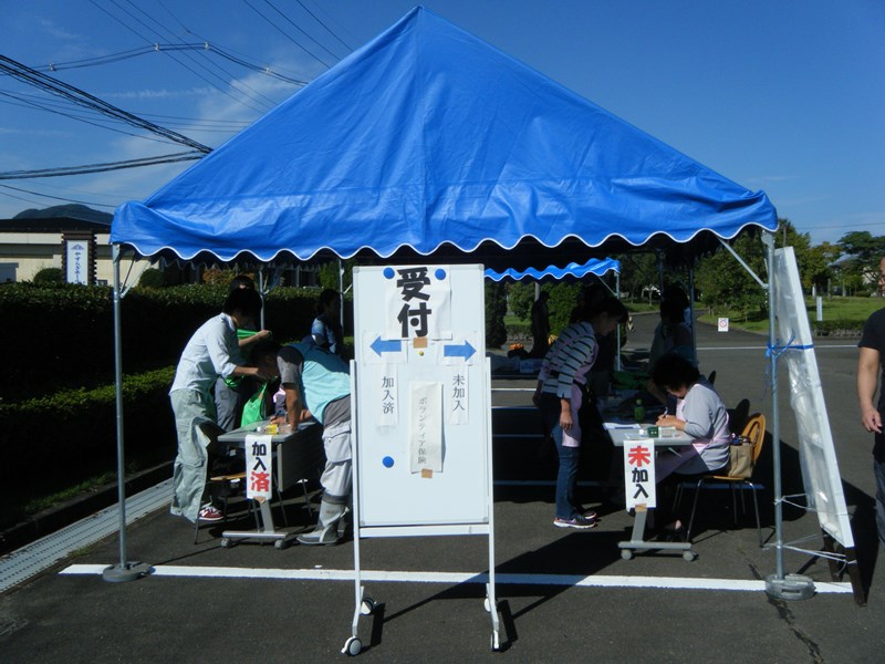 | ①受付開始 9:00から受付を開始します。 ボランティア保険に加入済みの方(左)と未加入の方(右)に分かれて、受付の列に並びます。 |