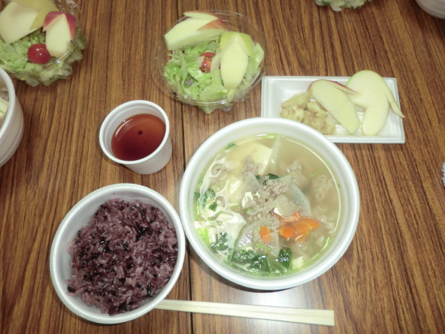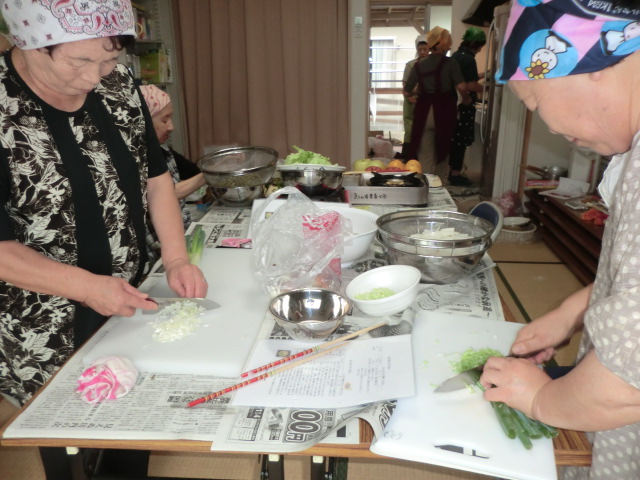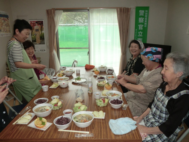 中井小学校住宅談話室にて栄養士会の方々による料理教室が行われ、3名の方にご参加頂きました。中井小学校住宅では3回目の開催となりますので、アットホームな雰囲気の中、栄養士さんの指導を受け調理しました。今回のメニューは古代米ご飯にフレンチサラダ、さんまのすり身汁にかぼちゃプリンです。