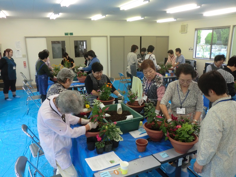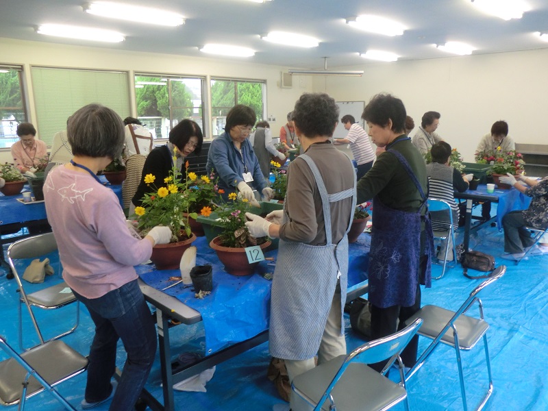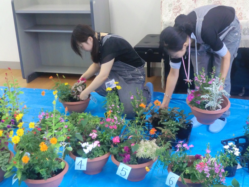 その後、講師により一人5種類ずつの植物が多様に鉢にセットされると、さあ!くじ引き開始!申し込み順にくじを引き、自分のセットが分かると参加者は番号の付いた鉢へ。互いに花を見比べて同卓内で交換したり、「挿し木して増えたらちょうだいね。」などと植物を通し会話も弾んでいました。最後に出来上がった寄せ植えを持ち記念撮影をしましたが、皆さんの笑顔の花が咲きほころんでいました。