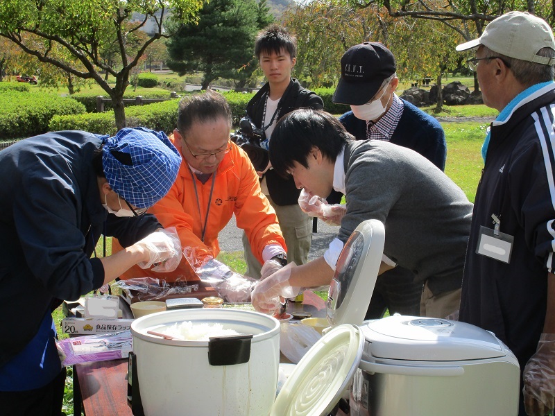 女性陣が馴れた手付きで味噌味と醤油味の2種類の芋の子汁を作り、男性陣もおにぎり作りに奮闘。