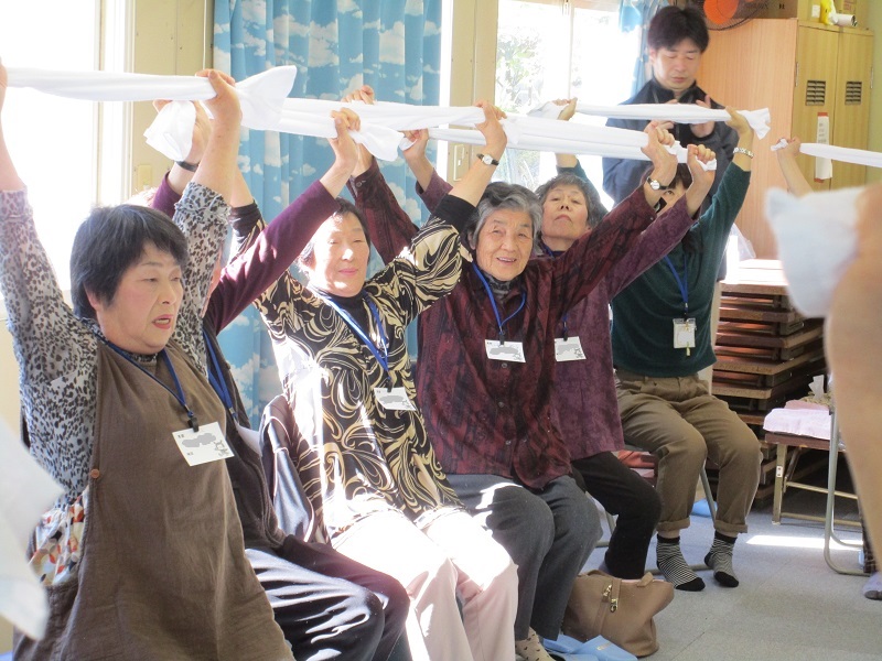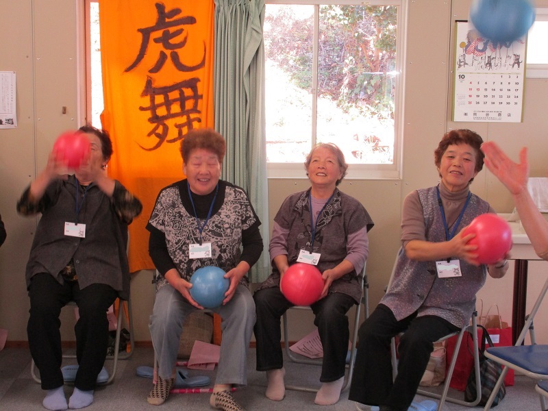 今回は指の体操や、ボール、タオルを使った簡単な運動をしました。なかなか思う様にできない時は皆で笑って、楽しく程よく体を動かす事ができました。運動の後はお茶会でおしゃべりをして、とても楽しい時間を過ごす事ができ、皆さんに喜んでいただきました。