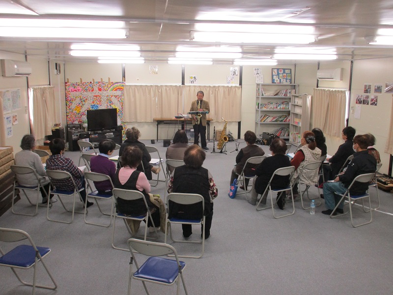 参加された方々は、耳覚えのある曲に歌詞を見ながら演奏に合わせて合唱をしました。音楽会の後は、楽団ひとりさんが用意されたお菓子を頂きながら「お茶っこ」をし、楽しい時間を過ごしました。
