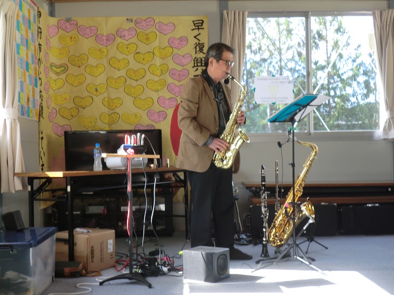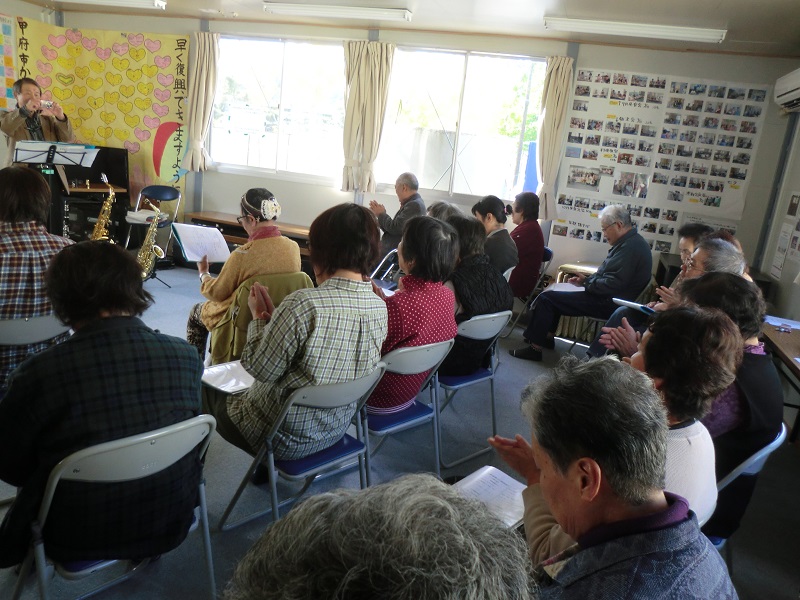 条南中学校住宅集会場にて、楽団ひとりさんによる演奏会を開催しました。21名の来場者があり、今まで楽団ひとりさんが回った仮設の中で、参加人数が一番多かったそうです。