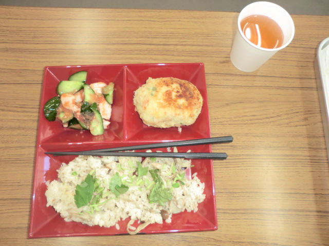 今回のメニューは3種のきのこの混ぜご飯とツナじゃがコロッケ、たたき長いもときゅうりの明太和えです。