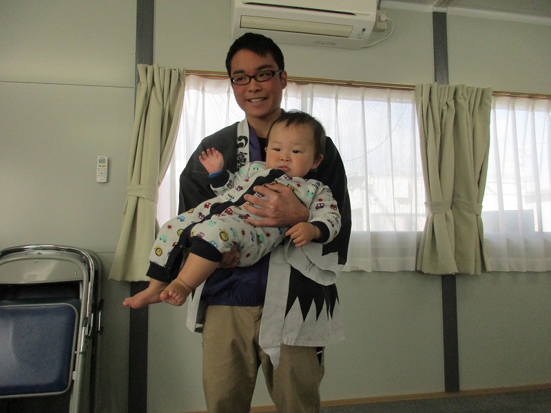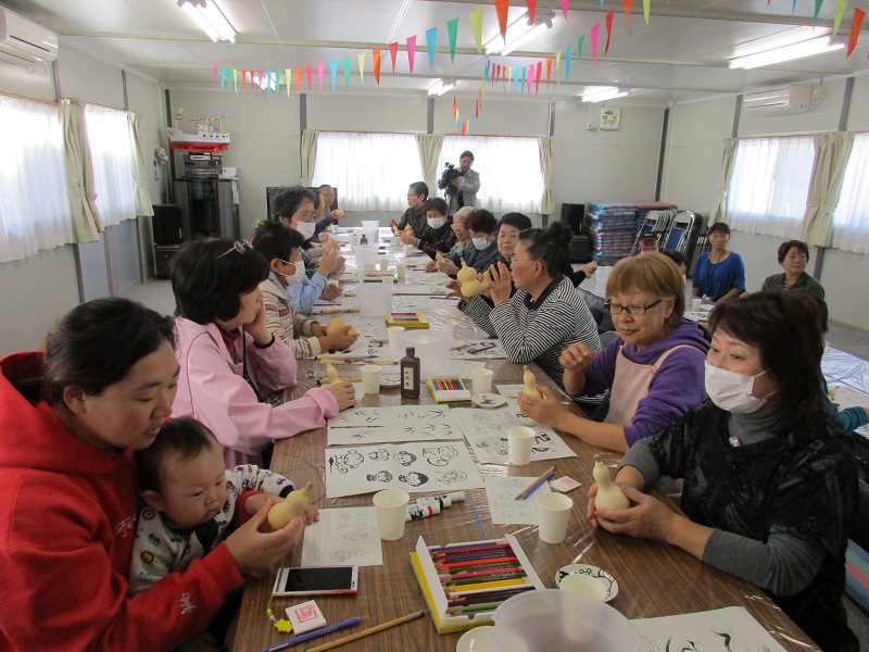 孫のような生徒さんに教わり嬉しそうな住民さん、また赤ちゃんを連れて参加したママさんは弟のような生徒さんに子守を頼み、ひょうたん絵付けに挑戦しました。