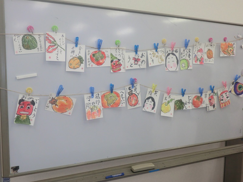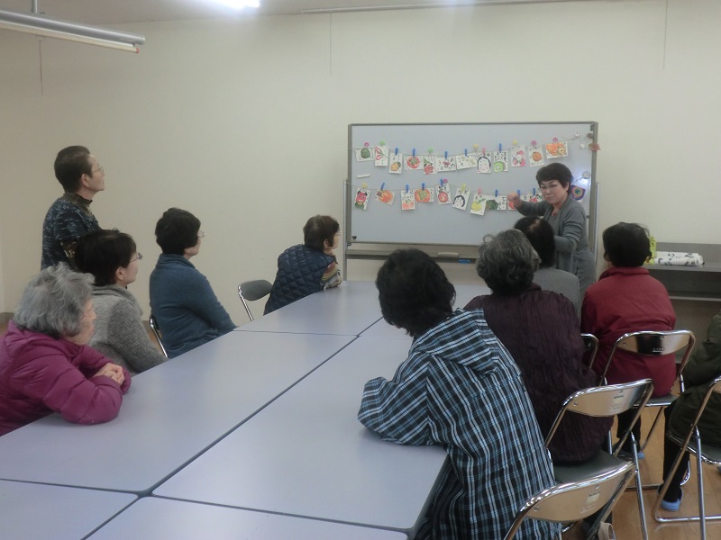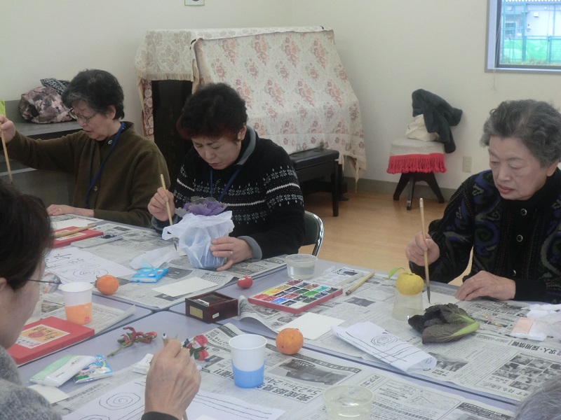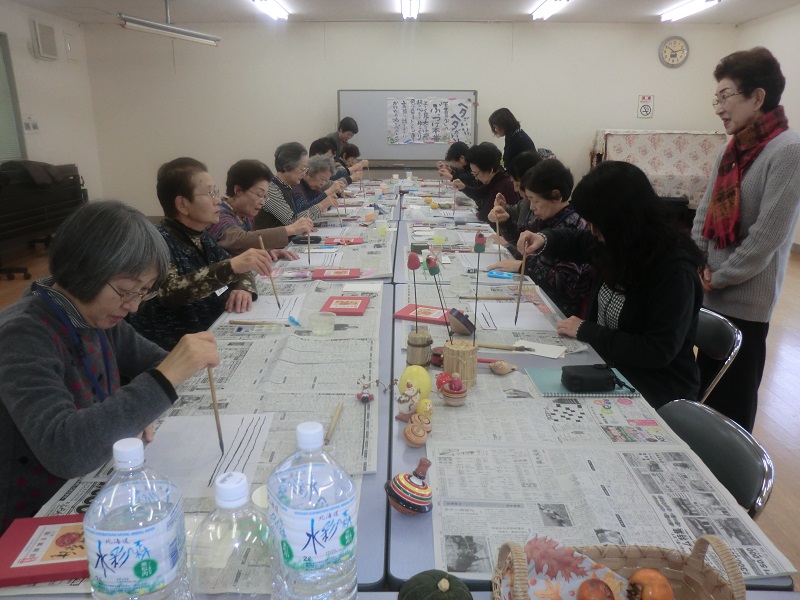 日本絵てがみ協会の方を講師にお迎えし、筆の持ち方に始まり、線・渦巻き・名前を練習してから早速ハガキに季節の果物や正月の置物を画材に描きました。先生の「下書きなしのぶっつけ本番!」という声を受け、なかなか筆が進まない方もいらっしゃいましたが、“へたでいい、へたがいい”をモットーにアドバイスを受けながら素敵な作品が仕上がりました。