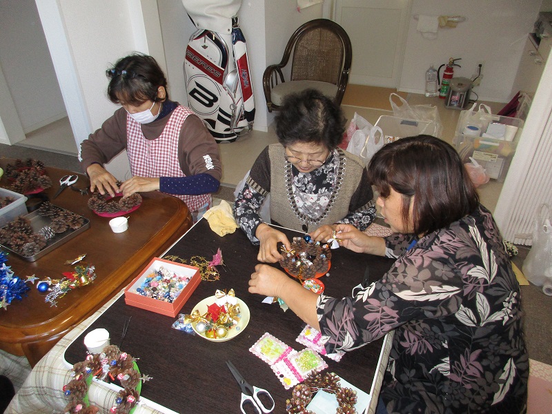 皆さん、色とりどりの台紙に貼り付けた松ぼっくりに、思い思いの飾り付けを行いました。完成したリースはどれもきらびやかで、作った方の個性が光る一品となりました。