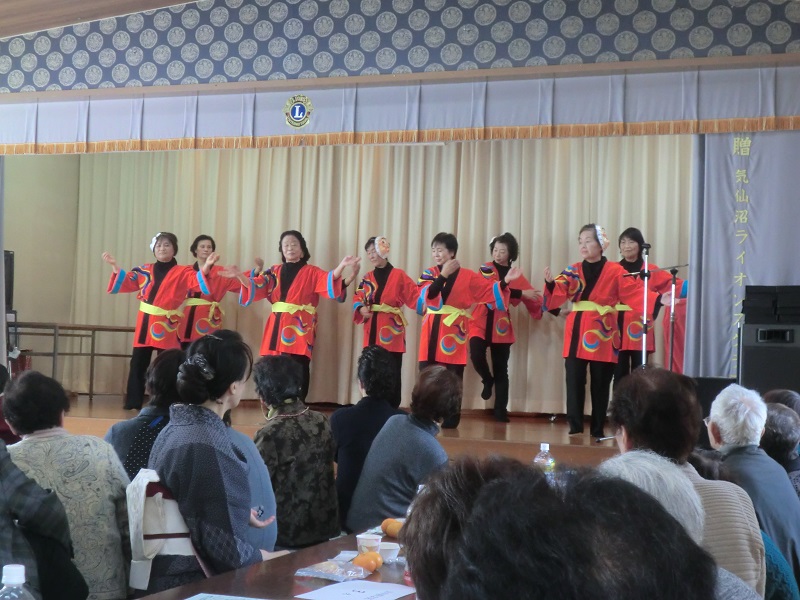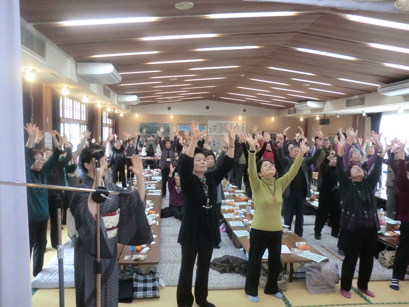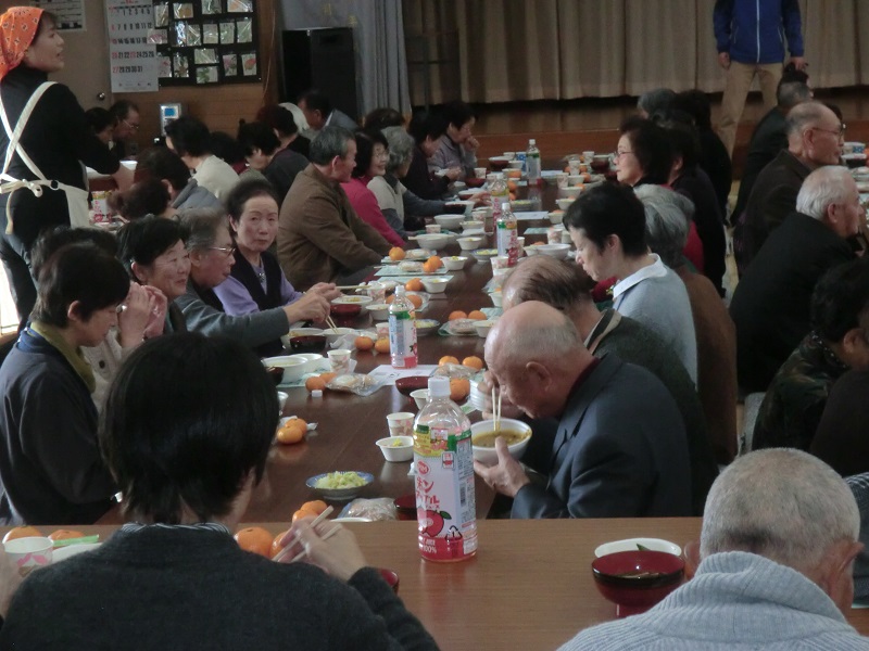 開会を待つ間には手づくりの柚子茶が配られ、会場は柚子のよい香りに包まれていました。しあわせの会会長の挨拶に続き、地区社協会長より祝辞を頂戴し乾杯。お待ちかねのかぼちゃ粥が配膳されると、皆さんお箸がすすみ完食していました。食後にはしあわせの会会員による賑やかなアトラクションや参加者の日舞もあり楽しい時間を過ごしました。生活支援相談員による「いけいけ!お茶っこ体操」は殆どの方が立ち上がり元気に体操していました。最後には全員で「おいらの船は300トン」の曲に合わせ炭坑節の振り付けで輪になって踊り、みんなが一つになれた会でした。