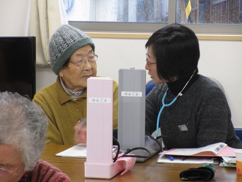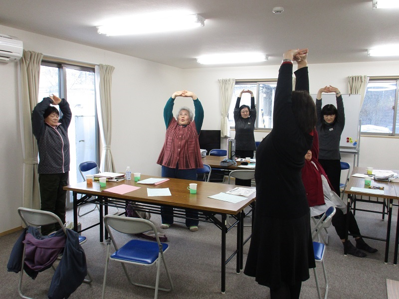 教室では生活習慣や食生活に関する講話の他、保健師や看護師の方々による血圧測定や、ストレッチ、そしてお茶っこ体操を行いました。参加された皆さんは、軽い運動や楽しいおしゃべりでリフレッシュされたようでした。