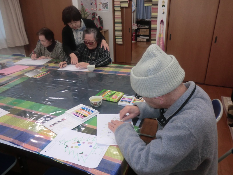 脳の体操の一環としてペンで点をつないで日本地図を描いたり、タオルを使った簡単ストレッチも行いました。ストレッチでは、皆さん身体が少しずつ柔らかくなり、ぽかぽかと体が温まったようでした。肩こり解消にもなるそうです!