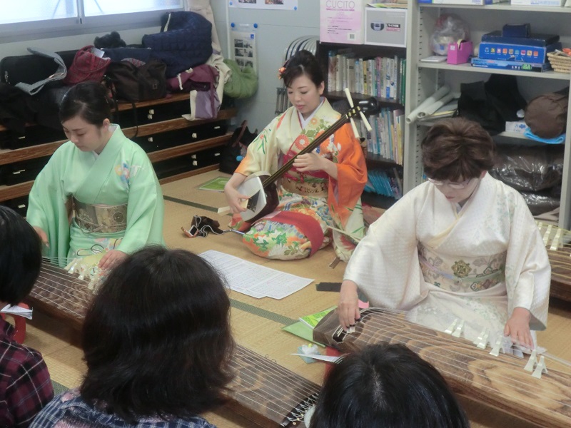 3張の筝による合奏は癒しの中にも迫力があり、普段あまり聞く事の無い胡弓・三味線・箏の音色を堪能する貴重な体験となりました。参加された皆さんは美しい音色にうっとりと聴き入っていました。