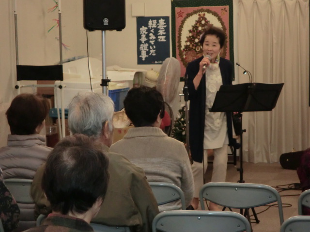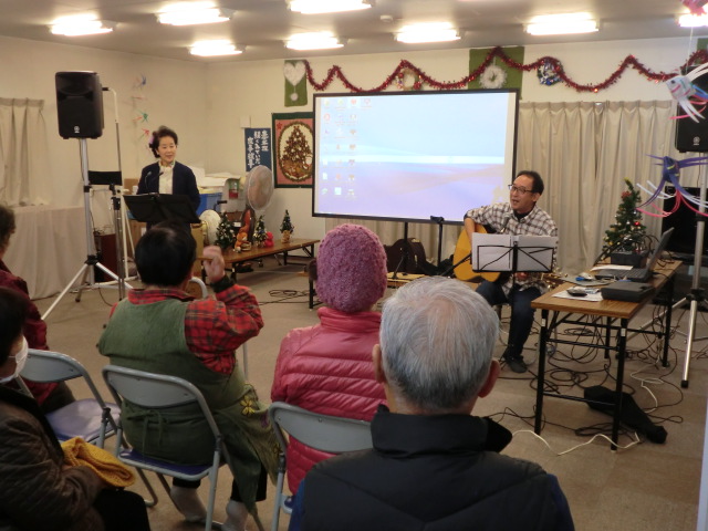 今回は忘年会として鹿折中学校住宅を会場に、気仙沼在住のフォークグループ『フラワー☆スカイ』さんをむかえ行われました。フォークソングの名曲が歌われ、フォーク世代にはどれも耳慣れた曲で、ひととき青春時代に戻ったようでした。後半は、震災前の気仙沼の美しい映像のスライドをバックにオリジナル曲が歌われ、久しぶりに見る懐かしい情景と透明感のある歌声に胸が熱くなり、涙を流していた方もおられました。