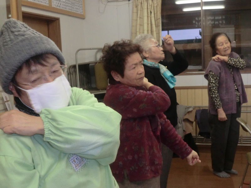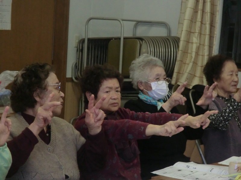 始めに保健師さんによる介護予防の講話と指の運動が行われ、皆さん真剣に聞き入り無理なく体操をしていました。お茶っこ体操は「北国の春」の曲に合わせ、口ずさみながら行ました。その後、かぼちゃ粥をご馳走になり幸せな気分になったところで、ハンドベルに合わせ「キラキラ星」を合唱し解散となりました。