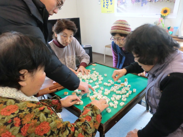 今月の「あづまっぺ趣味のじかん」は、鹿折中学校住宅にてこれまでの中で好評だった『健康麻雀』と『囲碁ボール』を行いました。