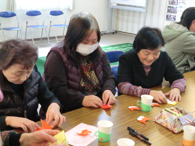 囲碁ボールはチームを変えて何度か対戦した後、お茶を飲みながら折り紙でホヤぼーやを作りました。