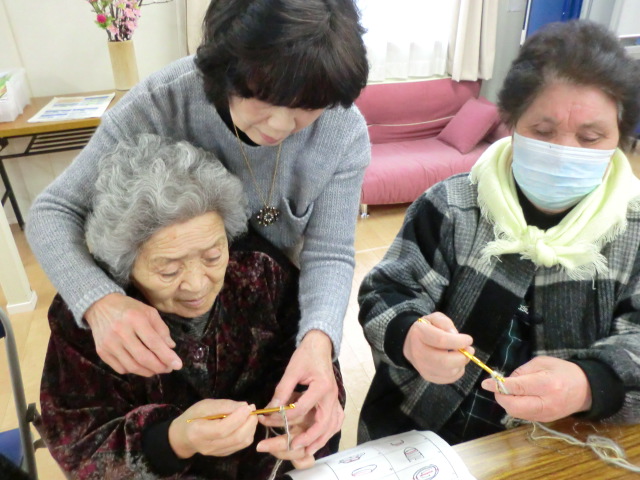 面瀬中学校住宅集会所に、忠臣蔵のまち播州赤穂より3名の方が来訪され、住民の方に手編みのホームカバー作りを教えて下さいました。2時間で片方完成!を目標に先生に教わったり、参加者同士で教え合いながら、見事に目標達成し、皆さんの足と心が暖かくなったみたいです♪もう片方はお部屋でゆっくり復習ですね。